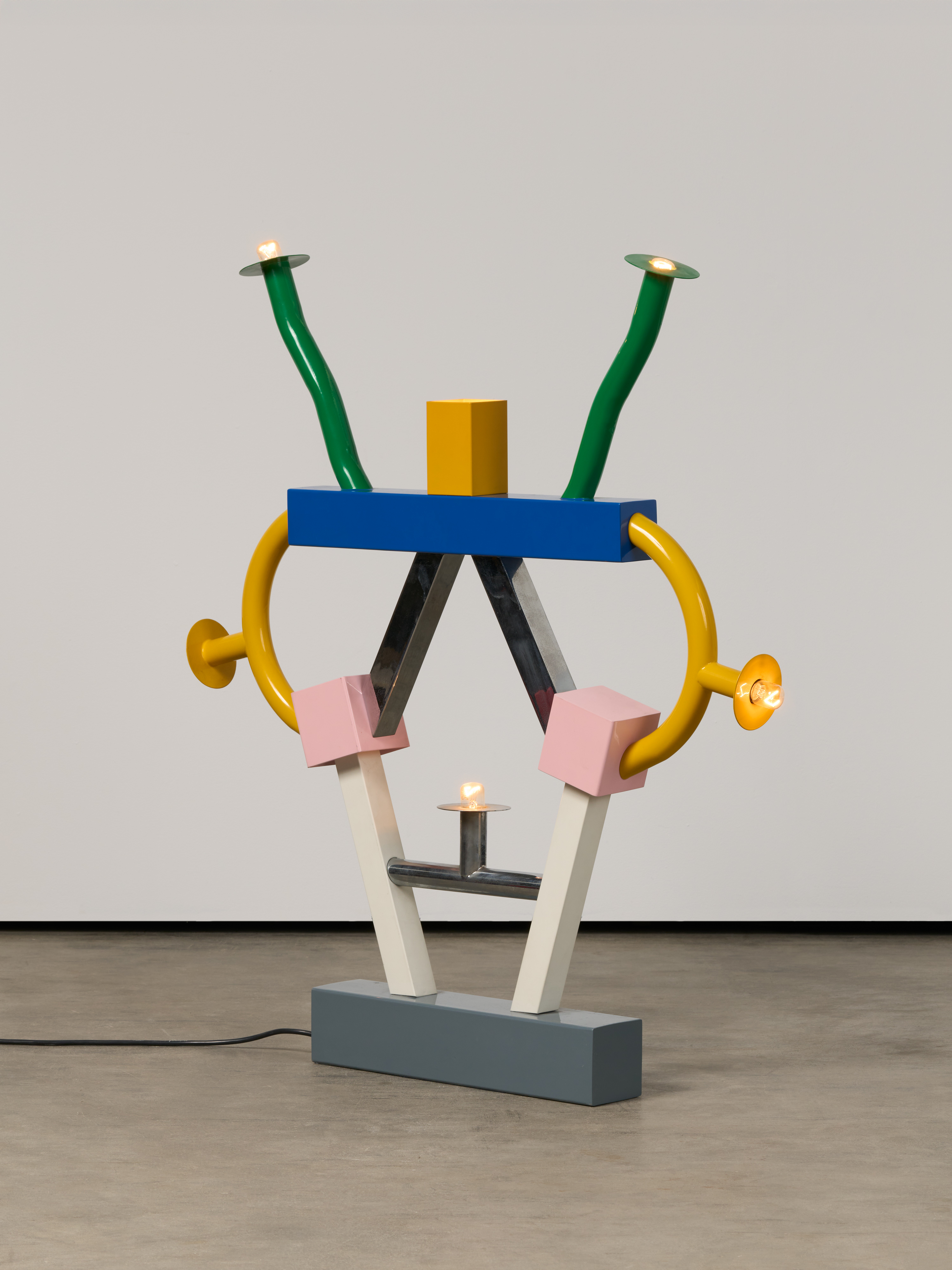 Technik: Metall, teilweise farbig lackiert, Glühbirnen, elektrifiziert.