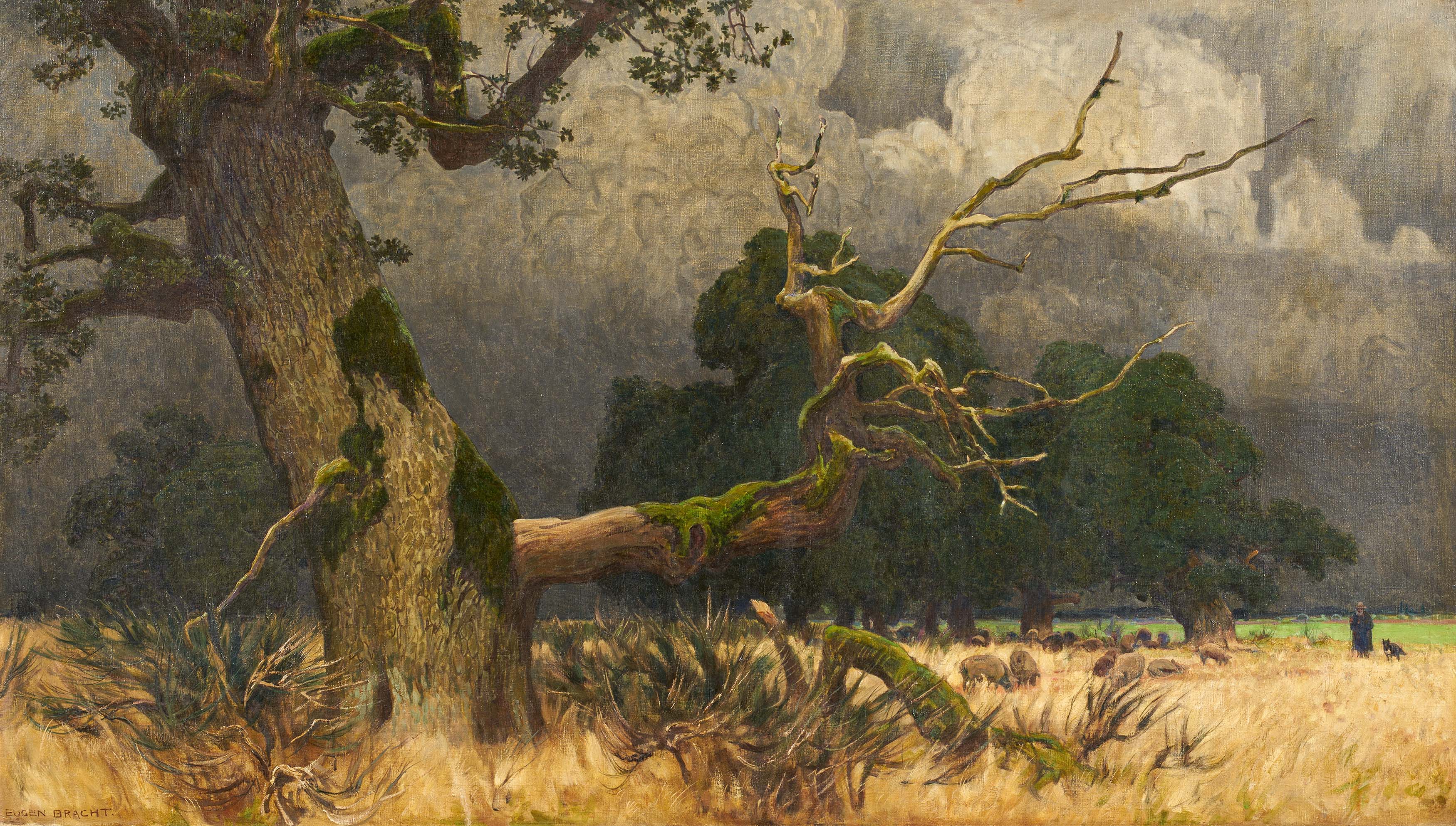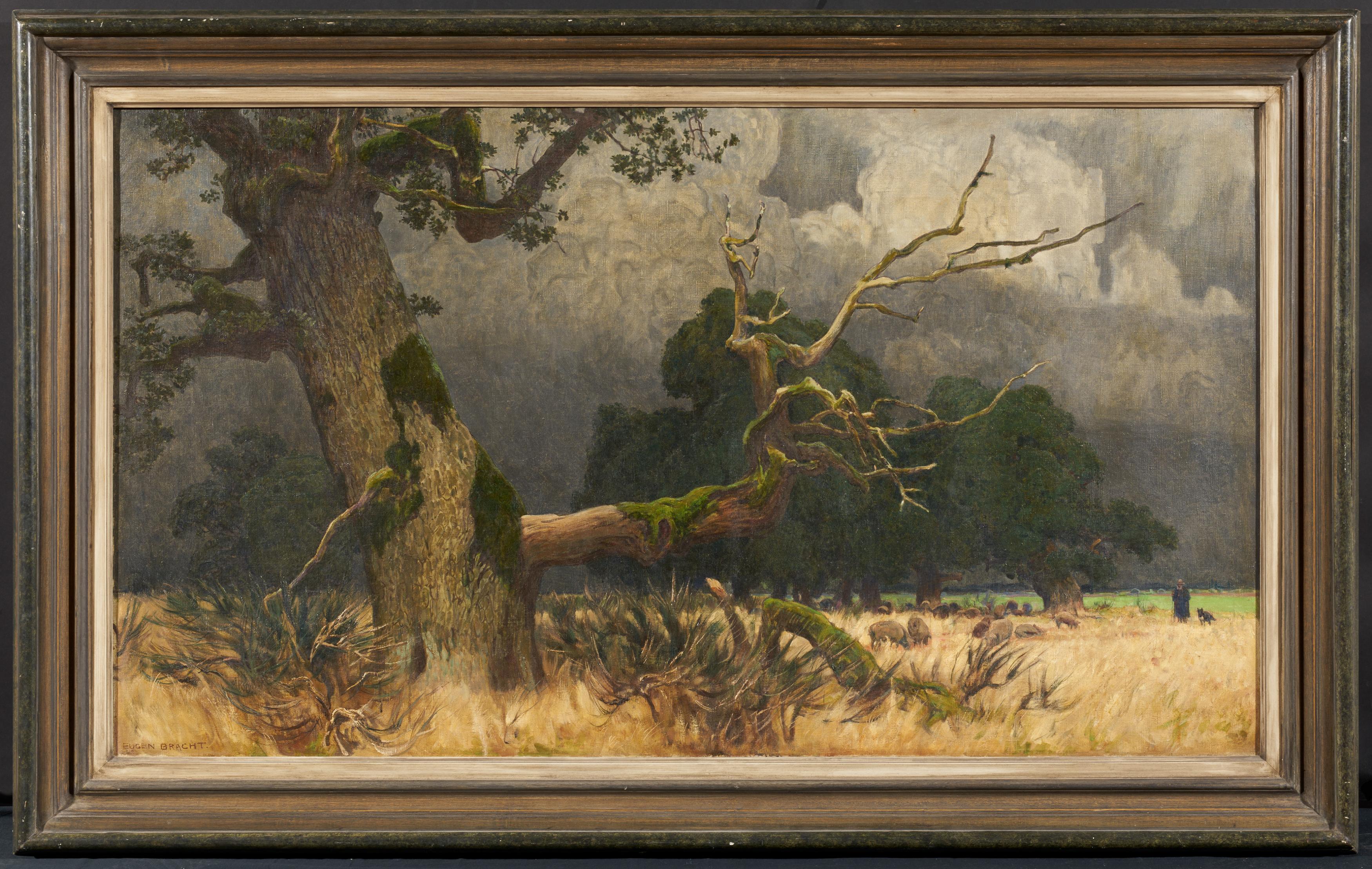 Der Landschaftsmaler Eugen Bracht wird 1842 in Morges in der Schweiz geboren und wächst in Darmstadt auf. Er erhält bereits früh Mal- und Zeichenunterricht und studiert in Karlsruhe und Düsseldorf. 1883 zum Professor für Landschaftsmalerei an der Preußischen Akademie der Künste in Berlin ernannt, folgt Bracht 1902 dem Ruf an die Königliche Akademie der bildenden Künste Dresden. Seiner Heimatstadt Darmstadt bleibt er zeitlebens in seinen landschaftlichen Motiven verbunden. Eine Ehrenmitgliedschaft in der "Freien Vereinigung Darmstädter Künstler" veranlasst Bracht zur Teilnahme an deren Ausstellungen, in denen er stets heimatliche Motive zeigt. So auch das vorliegende Gemälde, welches auf einer Studie aus dem Kranichsteiner Park in Darmstadt beruht. Die Hinwendung zur Freilichtmalerei und die impressionistischen Einflüsse auf das Oeuvre Brachts werden während seiner Zeit in Dresden immer deutlicher und führen schlussendlich zu seinem künstlerischen Durchbruch.