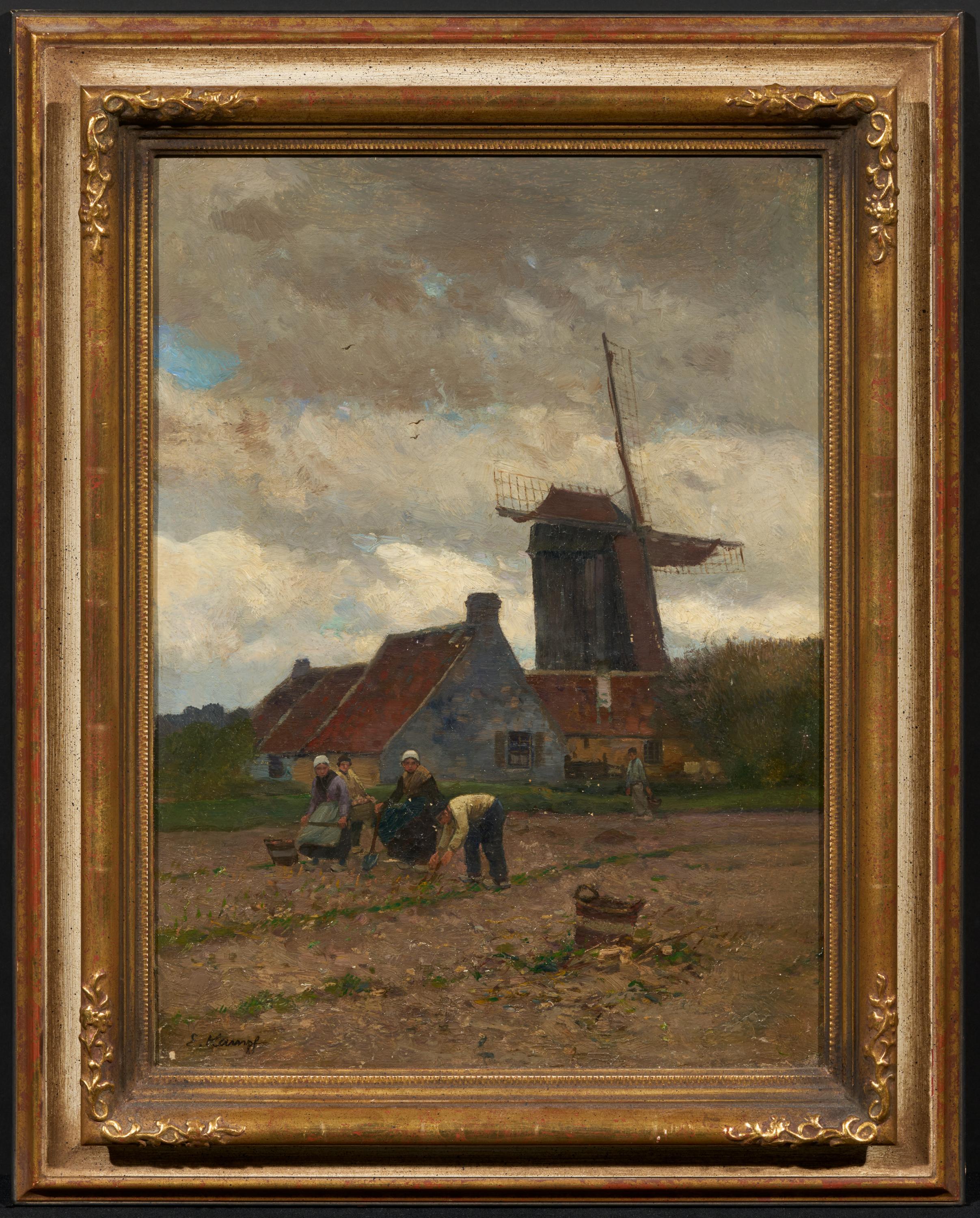Titel: Bauersleute auf dem Feld am Dorfrand.