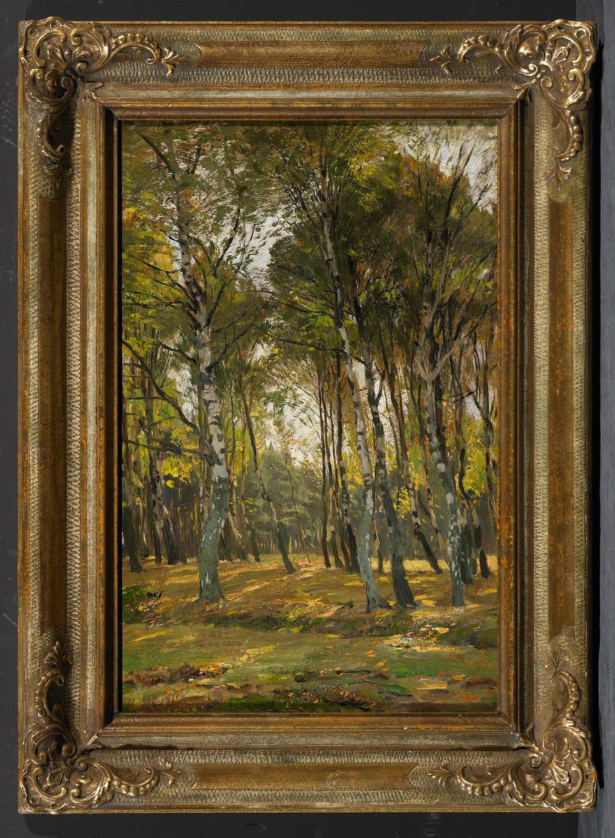 1841 Arensburg - 1916 DüsseldorfSommerlicher Birkenwald. Öl. Karton x 31 Rahmen: