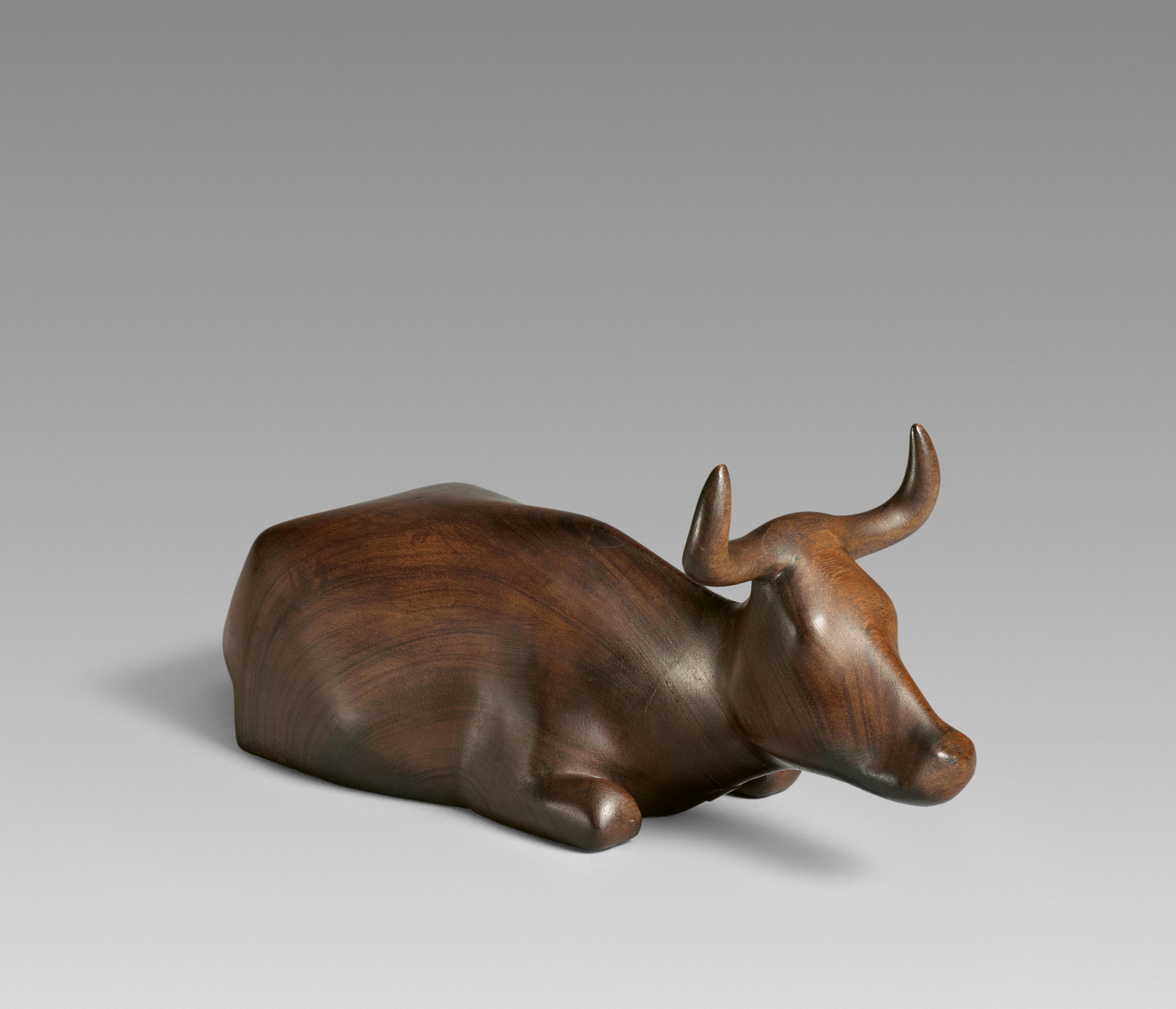 Die Skulptur stammt aus der Mitte der 1920er Jahre, eine sehr fruchtbare Phase im Werk von Mataré. Ausgebildet als Maler an der Berliner Hochschule fand Mataré Anfang der 1920er Jahre, inspiriert durch Fundhölzer am Strand, in die er mit einem Taschenmesser Motive hineinschnitt, zum Holzschnitt, zunächst unter Einfluss des Expressionismus. Über das Flachrelief findet er 1922 den Weg zur Plastik. Bereits seine ersten Skulpturen sind aus besonderem Holz geschaffen. Während der langen Sommeraufenthalte an Nord- und Ostsee faszinieren ihn Kühe in ihren unterschiedlichen Haltungen, vor allem wegen der Ruhe, die diese liegend, stehend oder kauernd ausstrahlen. Um diese Ruhe bildhauerisch zu erfassen, verwendet er eine sehr reduzierte Formensprache. Seine Arbeitsweise ist ebenso langsam wie behutsam. 1924 erwirbt er in Hamburg einen großen Block (750 Pfund schwer) exotisches, indisches (sehr hartes) Amaranth-Holz, welches er für wenige Plastiken verwendet. Auch die Maserung des Holzes spielt eine wichtige Rolle, wie bei unserer Kuh, wo diese in einer flachen Kurve die liegende Haltung des Tieres betont. Zu den Arbeiten aus diesem Holzblock, zählen liegende Kühe und ein Hahn. Stilistisch bilden diese Arbeiten eine Einheit. Am 5. Juli 1924 schreibt Mataré in seinem Tagebuch über das Holz: "Nun habe ich eine Kuh darin geschnitzt, mit großer körperlicher Anstrengung, denn es ist sehr hart und meine Hilfsmittel sind sehr gering." Bei der Arbeit zieht er sich eine Sehnenentzündung zu, wenig später zerbrach der Meißel. Mataré beklagt sich zudem des Öfteren über Brüche der Hörner oder Beine bei der Arbeit an seinen Skulpturen und erfährt diese als Bestandteil seiner Arbeitsweise. Auch bei dieser hier angebotenen Skulptur brach der vordere Kopfteil der Plastik vom Körper. Durch einen durch den Künstler eingebrachten Pflock am unteren Hals, welcher aus demselben Holzblock geschnitzt wurde, "reparierte" Mataré gekonnt seinen Schaden.