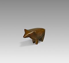 Mataré zeigt eine kompakte, in sich ruhende Tierfigur. Der trapezförmige Körper zieht sich elegant vom Wedel bis zum Haupt, das von zwei kleinen, spitzen Hörnern gekrönt ist. Die warme, goldbraune Patina unterstreicht die harmonische Geschlossenheit der Form. Mataré abstrahiert die Naturform behutsam, ohne ihr Wesen zu verlieren, und schafft eine klare, zeitlose Komposition. Die kleine Bronze steht exemplarisch für sein Streben nach Reduktion, Konzentration und formaler Vollendung, das sein gesamtes plastisches Werk prägt.
