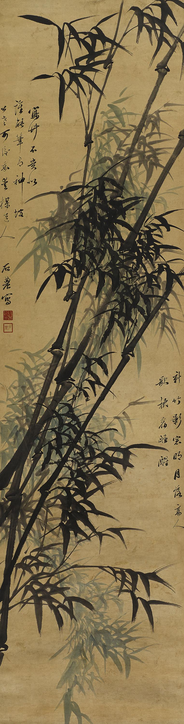 b) Bambus mit großen Sprossen. Rechts ein Gedicht, sign.: Shi Nong. Siegel: Chen Hong Fan yin. Shi Nong.