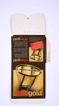 Technik: Kaffeesatzfarbe auf aufgefalteter Verpackung eines Kaffeefilters.