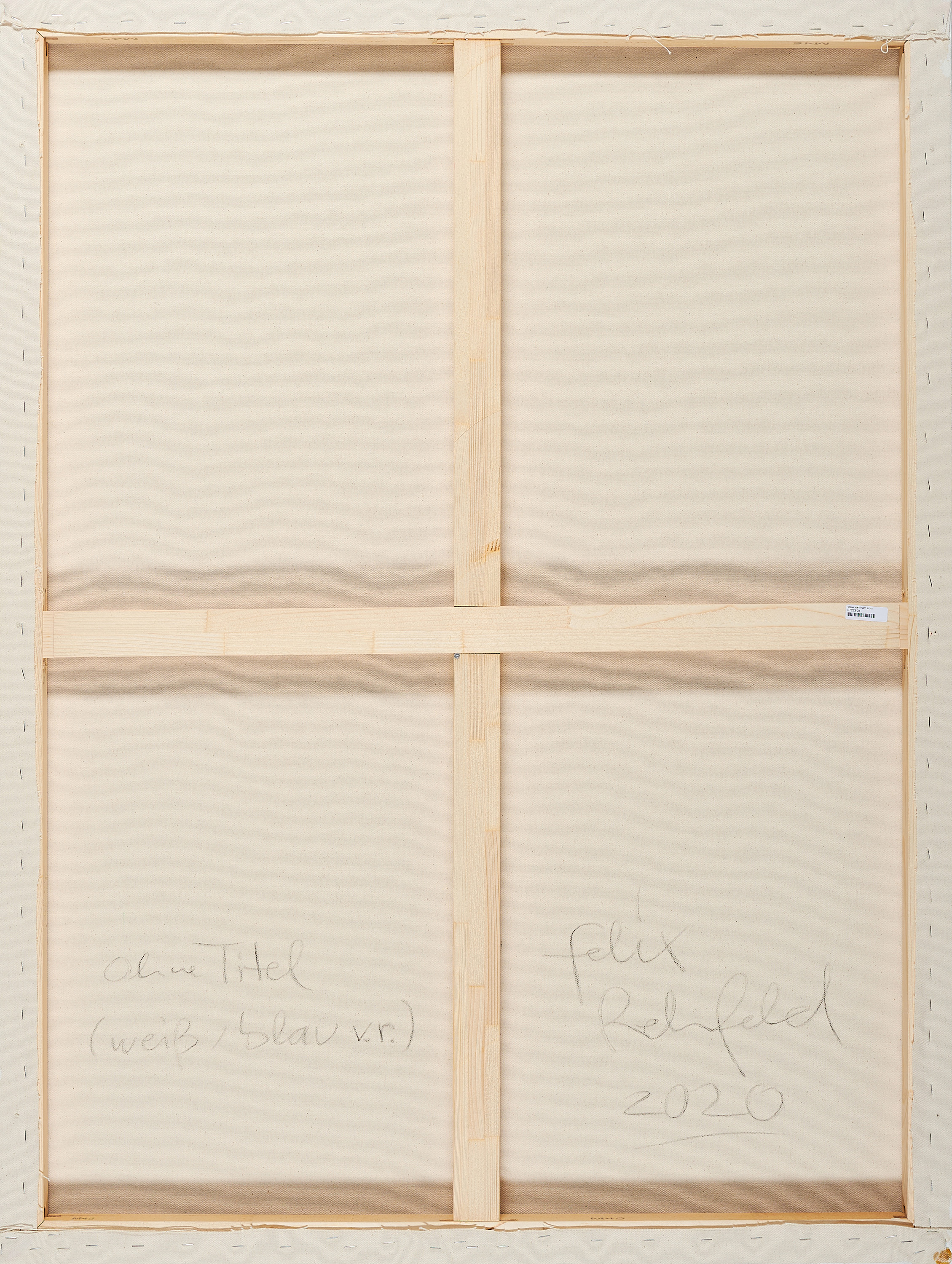 Bezeichnung: Signiert und datiert verso: felix Rehfeld. Hier zudem bezeichnet: ohne Titel (weiß / blau v.r.).