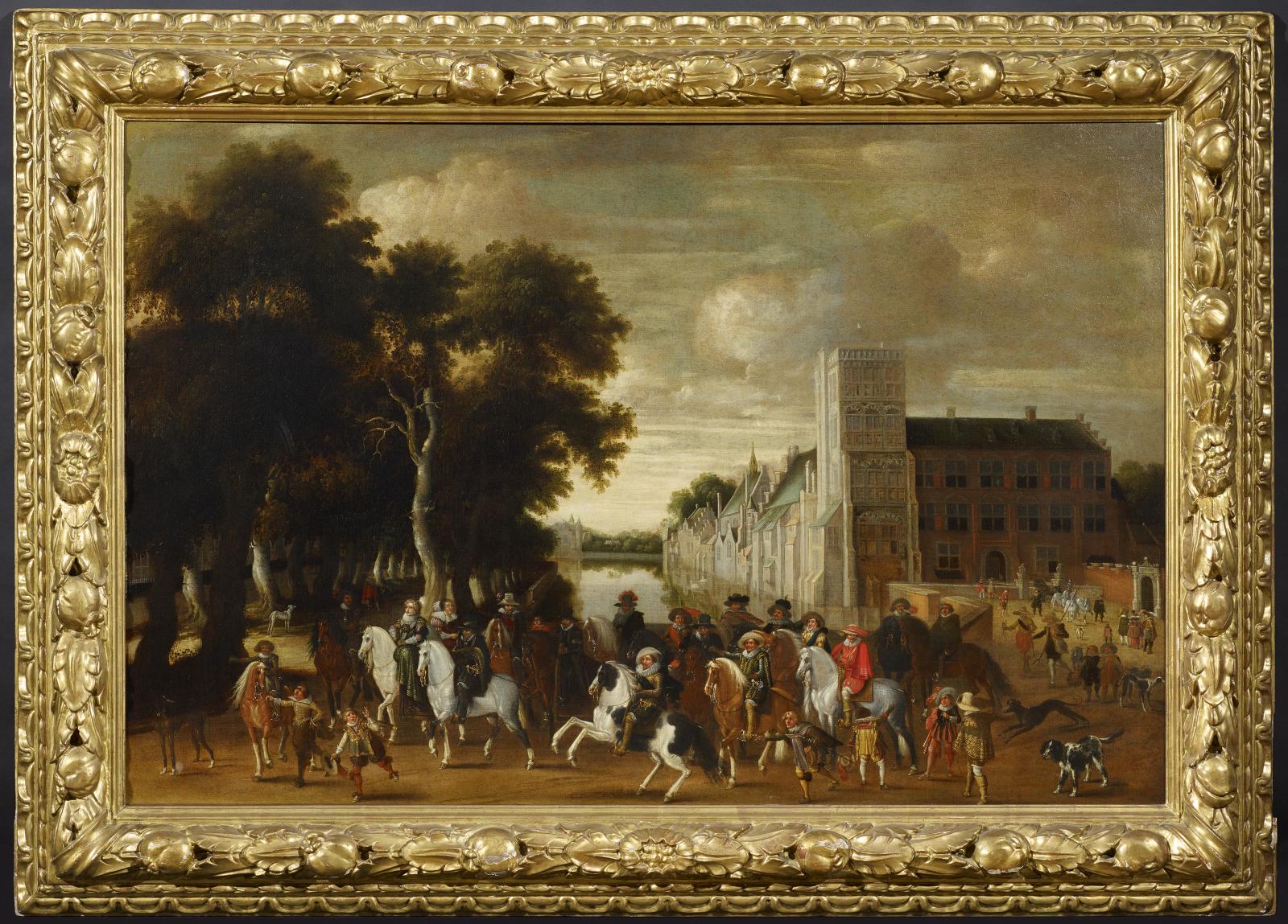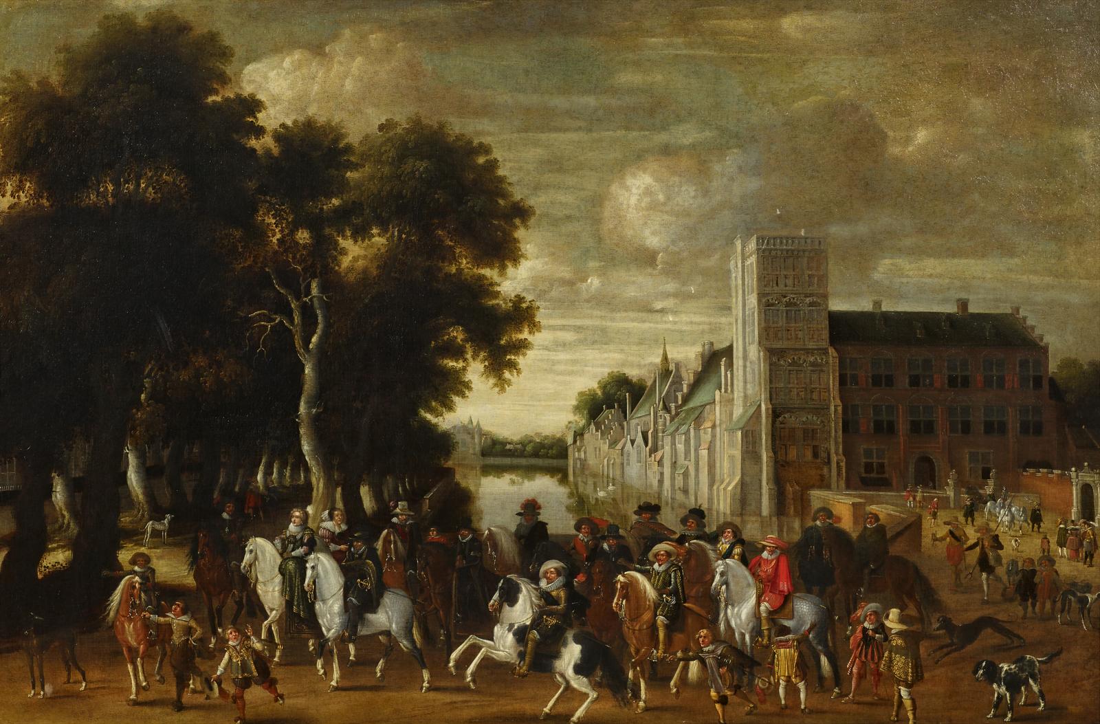 Moritz von Oranien in Gesellschaft des Prinzen Frederik Henrik von Oranien, des Königs von Böhmen Frederik V. und dessen Frau Elisabeth Stuart vor dem Binnenhof in Den Haag.