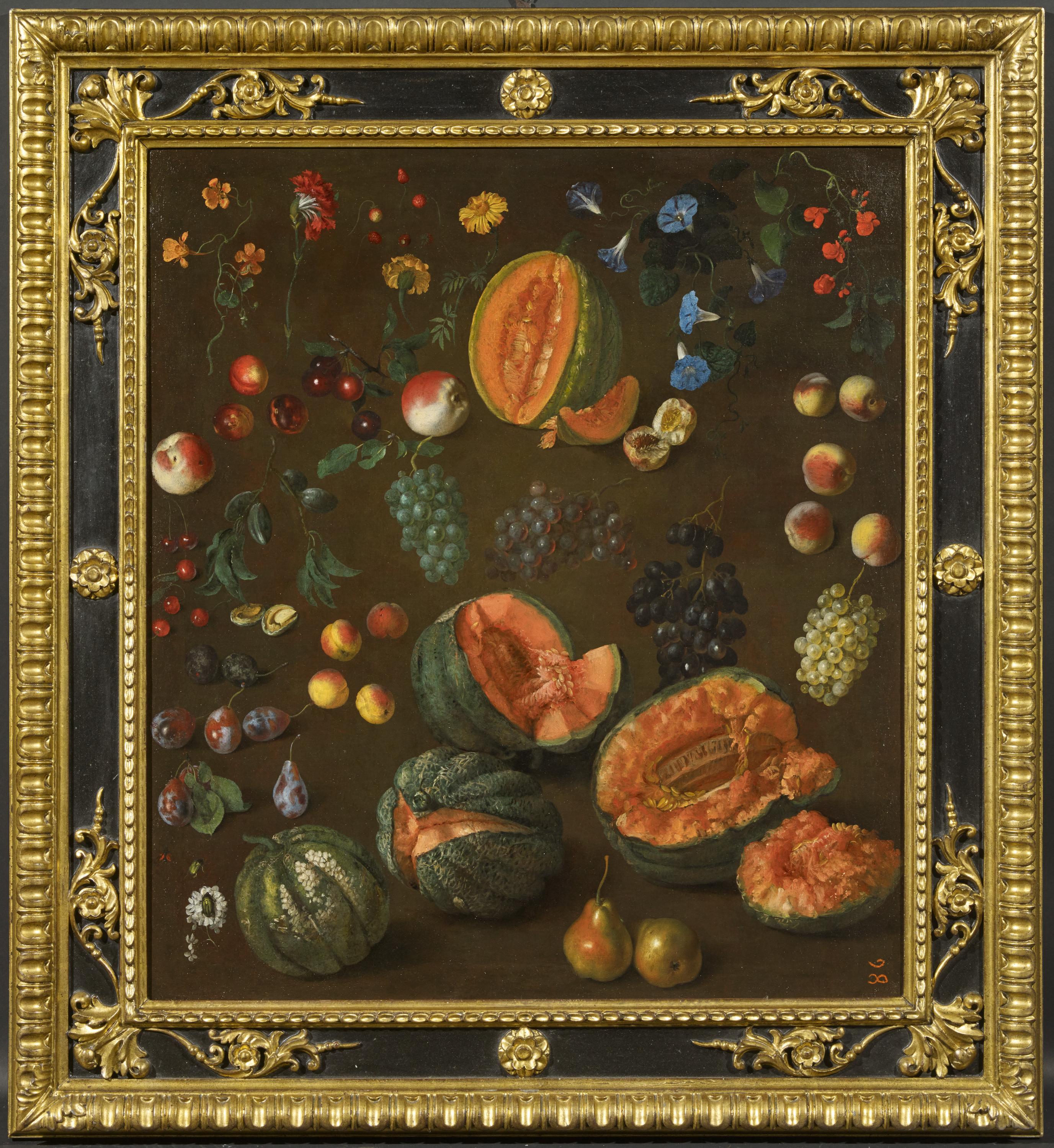 Vor einem braunen Hintergrund sind Blumen, Früchte und Insekten mit viel Geschick und Liebe zum Detail nachgebildet worden. Wir können unter anderem Pfirsiche, Kirschen, Birnen, Melonen, Pflaumen und sogar Nelken und Glockenblumen sehen. Diese Produkte der Natur sind nicht zu jeder Jahreszeit und nicht zur gleichen Zeit vorhanden. Gianluca Bocchi und Alberto Cottino interpretieren dieses Gemälde als ein Repertoire von Früchten und Blumen, das gegen Ende des 17. Jahrhunderts von einem Florentiner Maler für seine Werkstatt angefertigt wurde, damit von Zeit zu Zeit eine Frucht oder eine Blume zur Verfügung stand, die in verschiedene Kompositionen aufgenommen werden konnte. Die besondere naturalistische Wiedergabe jedes einzelnen Objekts spiegelt die damalige führende Rolle der florentinischen Kultur wider.