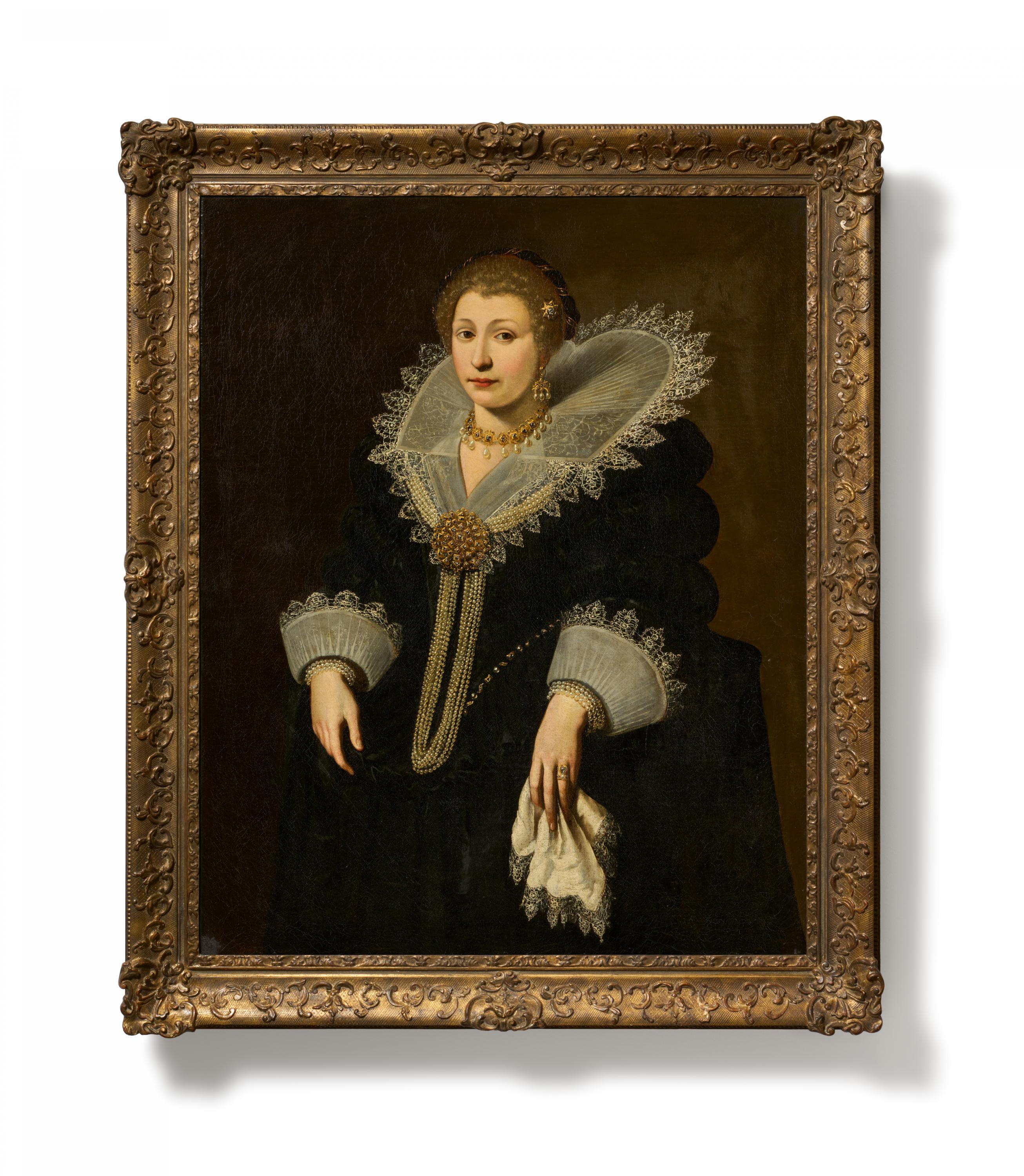 Der Schnitt des schwarzen Gewandes und des Kragens der Dame entspricht der französischen Mode um 1620. Die Puffärmel und der breite Stehkragen ähneln denen einiger Porträts der Töchter der Königin von Frankreich Maria de' Medici, die Frans Pourbus der Jüngere zu Beginn des zweiten Jahrzehnts des Jahrhunderts anfertigte. Dagegen verrät die malerische Gestaltung des Gesichts und der Hände der dargestellten Dame einen Malstil, der nicht französisch ist, sondern der Florentiner Schule des frühen 17.