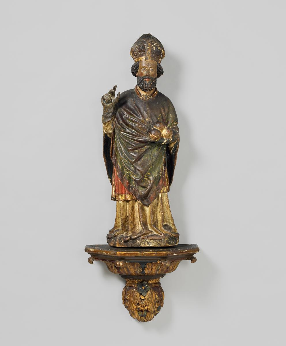 Heiliger Nikolaus. Standfigur, vollrund geschnitzt. Farbig gefaßt. Fassung mehrfach übergangen und bestoßen. Weichholz. Auf späterer Konsole. Höhe: 76cm.