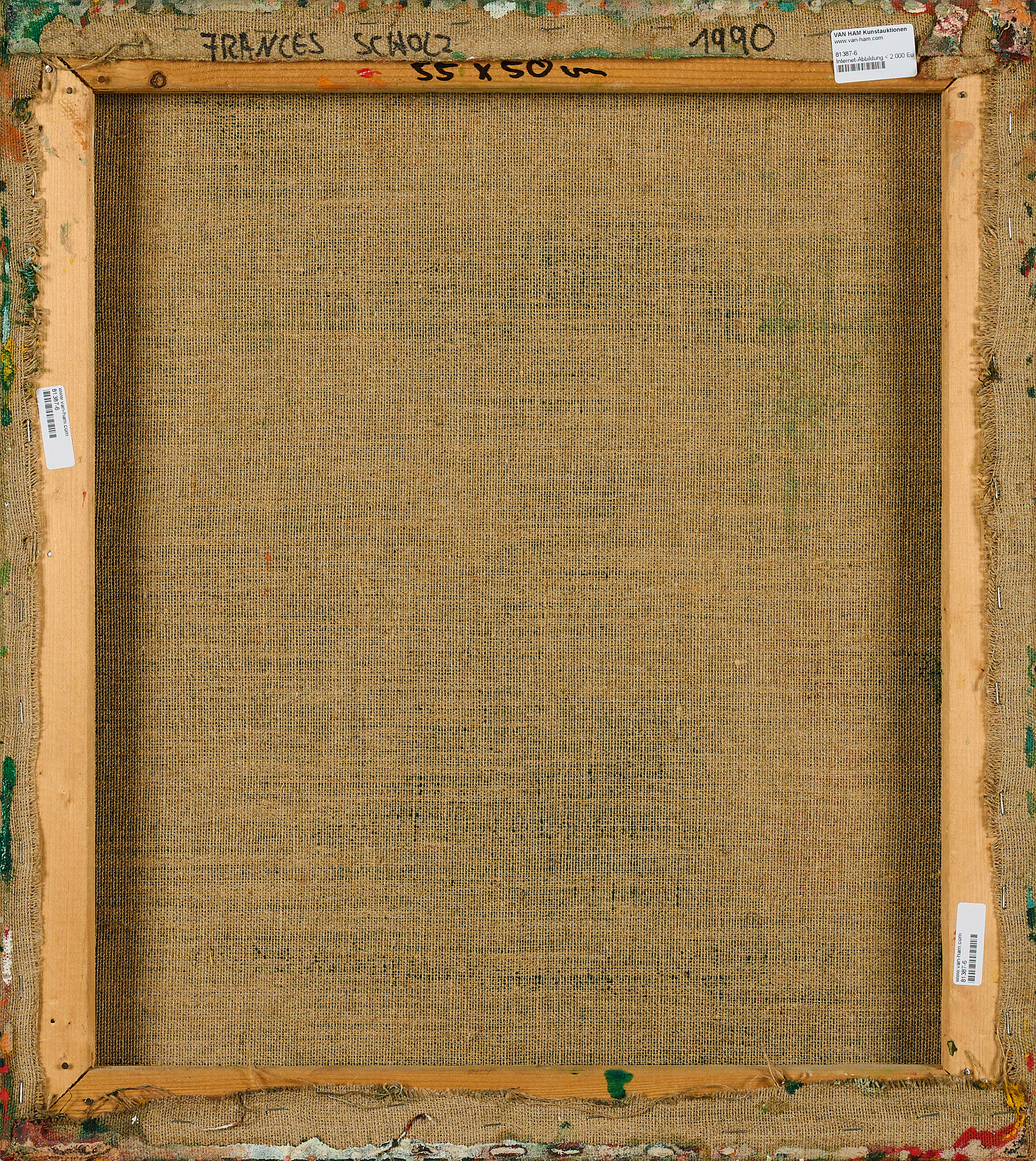 Bezeichnung: Signiert und datiert verso auf der umgeschlagenen Leinwand: FRANCES SCHOLZ 1990. Sowie bezeichnet auf dem Keilrahmen: 55 x 50cm.