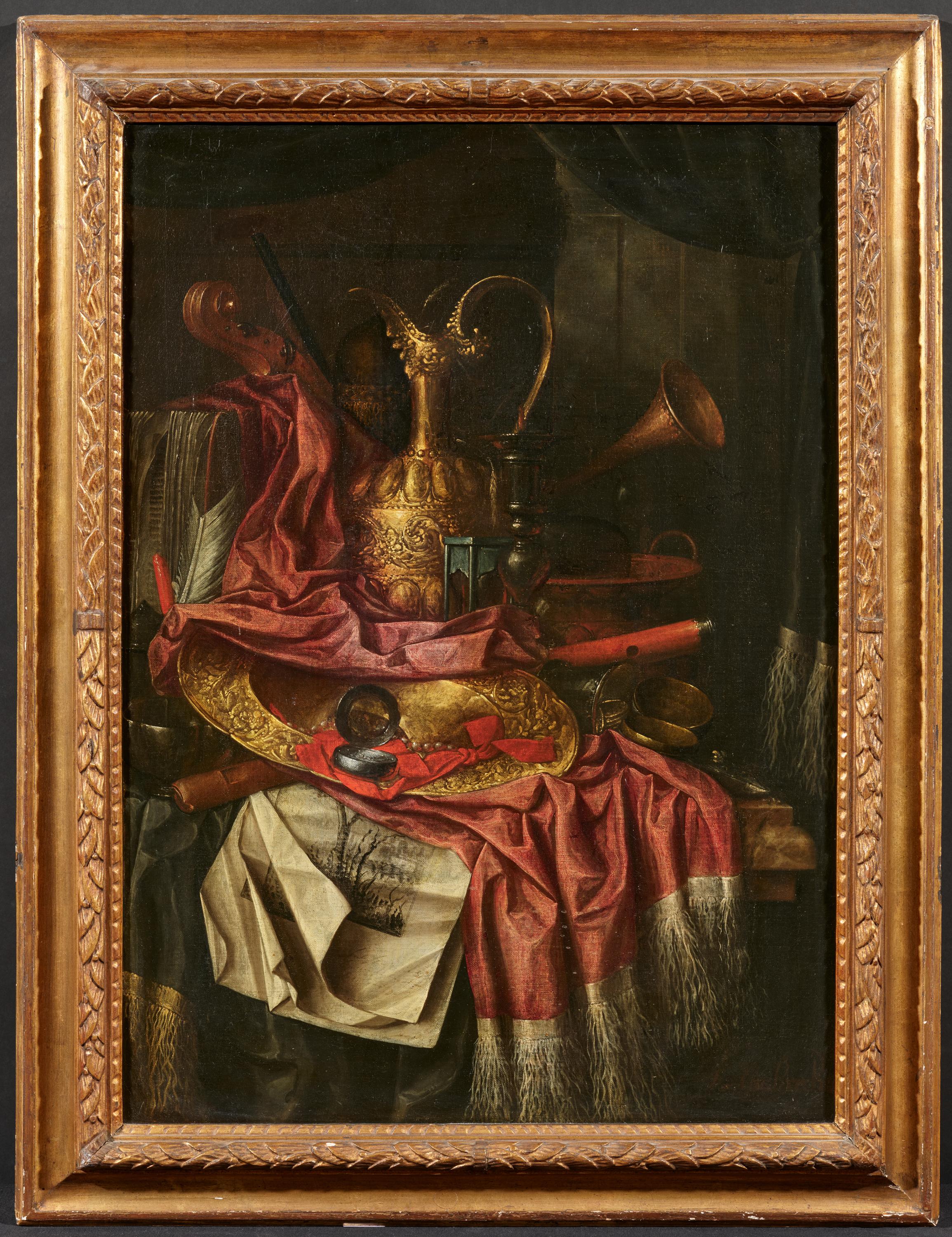 Titel: Stillleben mit goldener Helmkanne samt Becken, Musikinstrumenten und Grafik-Blättern.