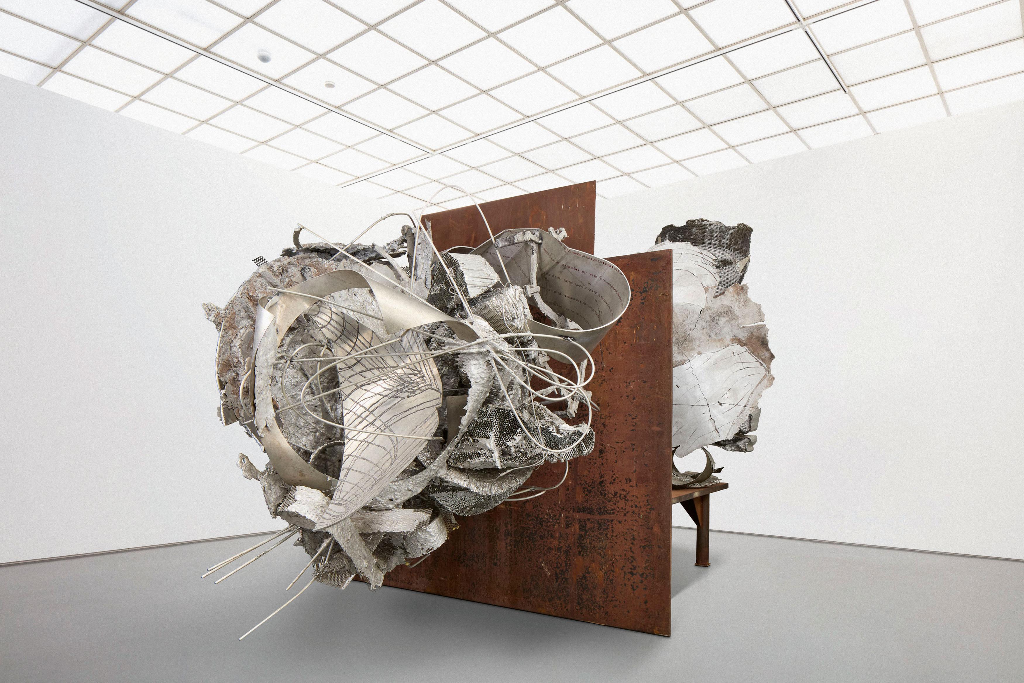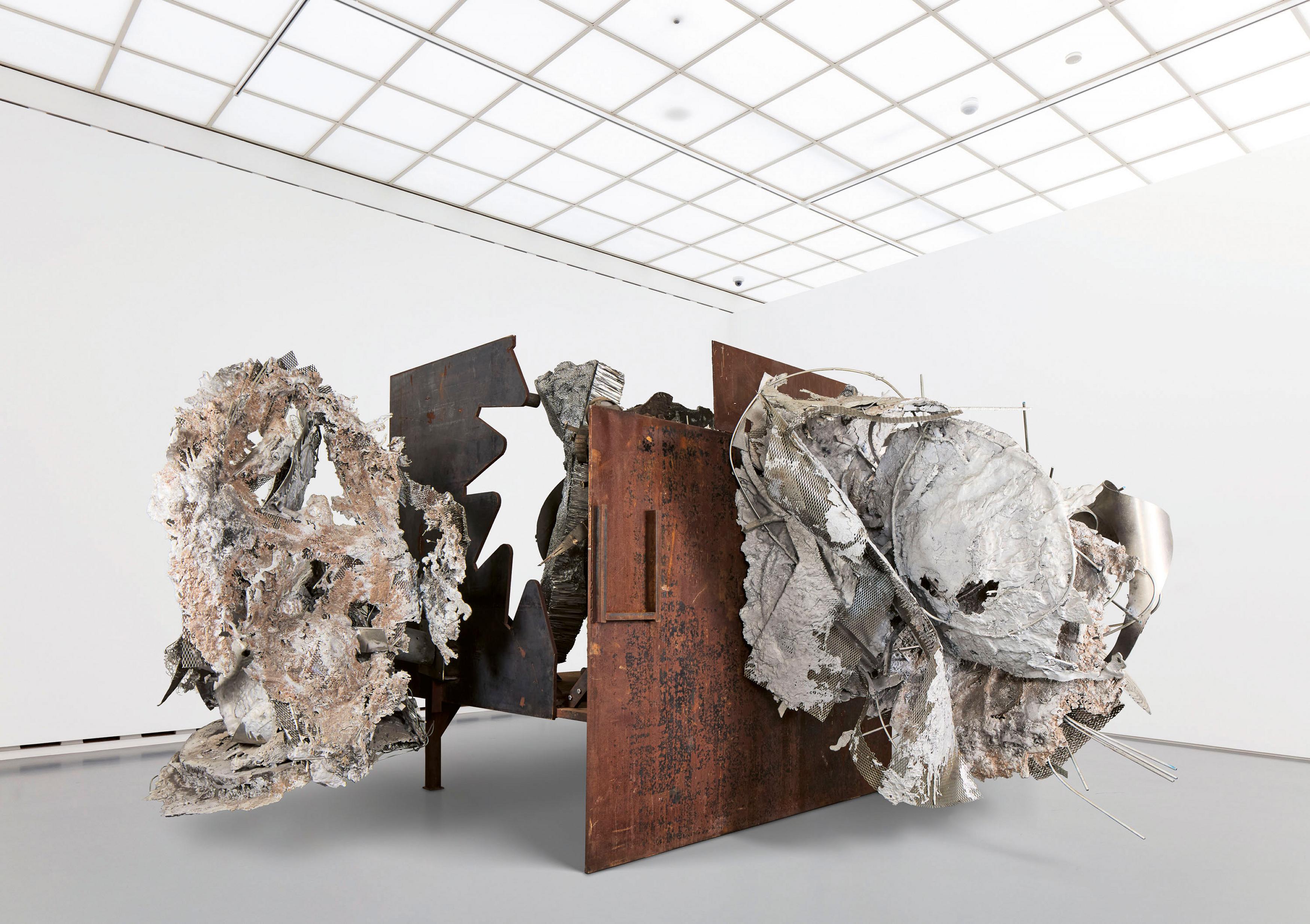 Drei korrodierte Stahlplatten geben dem Werk einen dreidimensionalen Rahmen, aus dem chaotisch anmutende, spiralförmig gedrehte und dynamisch gekurvte Formen ausbrechen. Die scheinbar willkürlich gewählten Materialien wie Stahl, Aluminium, Drahtgeflechte oder gipsartige Oberflächen, verdichten sich zu kraftvollen Strudeln, die sowohl Vitalität als auch eine apokalyptische Energie vermitteln. Die Komposition erinnert an Wellen, die an ein Floß schlagen, Netze oder Trümmer, an die Bewegung des Meeres, aber auch an industriellen Schrott.