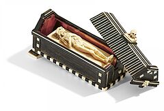Memento mori - Bedenke, dass du sterben wirst! Die Auseinandersetzung mit dem Vanitasgedanken, der Vorbereitung auf den Tod und somit auf das Jüngste Gericht und die Sicherung des eigenen Seelenheils hat im deutschsprachigen Raum eine lange Tradition. Es ist somit nicht verwunderlich, dass die Thematik über mehrere Jahrhunderte hinweg immer wiederkehrend und in Form unterschiedlichster Medien in der Kunst aufgegriffen wurde. Unser "Tödlein im Sarge" reiht sich nahtlos in die Tradition einer speziellen Form des Andachtsobjektes ein. In seiner Schauerlichkeit soll es den Betrachter an seine Sterblichkeit erinnern und ihm die Vergänglichkeit seines irdischen Daseins vor Augen führen. Die kleinen Personifikationen des Todes sind meistens alters-, standes- und geschlechtslos und sprechen somit zu jedem beliebigen Betrachter. Teils sind sie skelettiert, teils zeige Sie den menschlichen Körper mitten im Zerfall. Sehr oft handelt es sich um feingliedrige und filigrane Arbeiten aus Elfenbein, das dem Erscheinungsbild von bleichen, menschlichen Knochen sehr nahekommt. Tödlein dieser Art sind auch als Tisch- oder Taschensärglein bekannt. Neben ihrer Funktion als Meditationshilfe waren sie begehrte Kunst- und Sammelobjekte und dienten Laien zuweilen zum Studium der Anatomie..