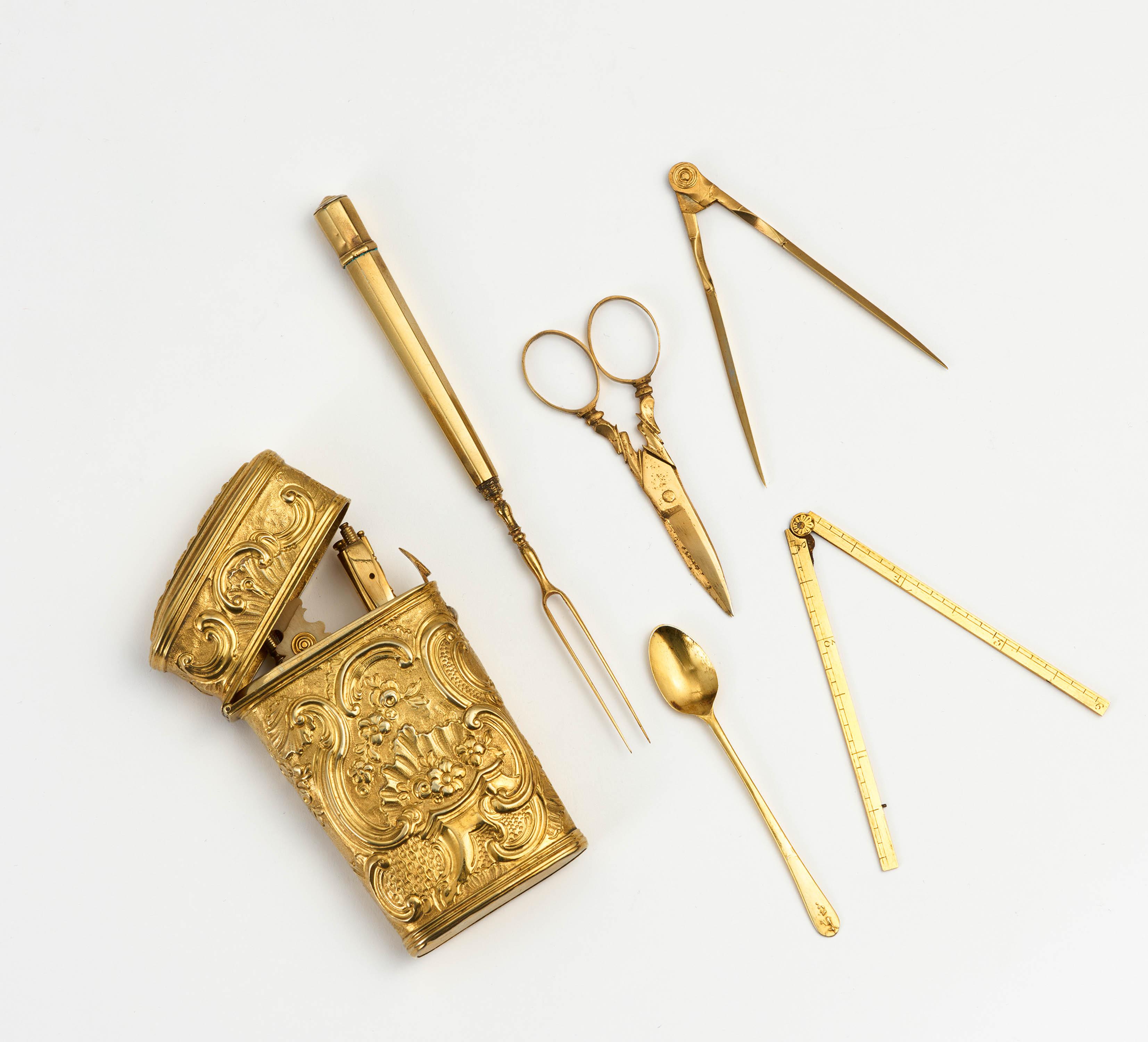 Zirkel, Maßstab, Pinzette mit Nagelfeile, Nähnadel, Häkelnadel, zwei kleine Messeraufätze,