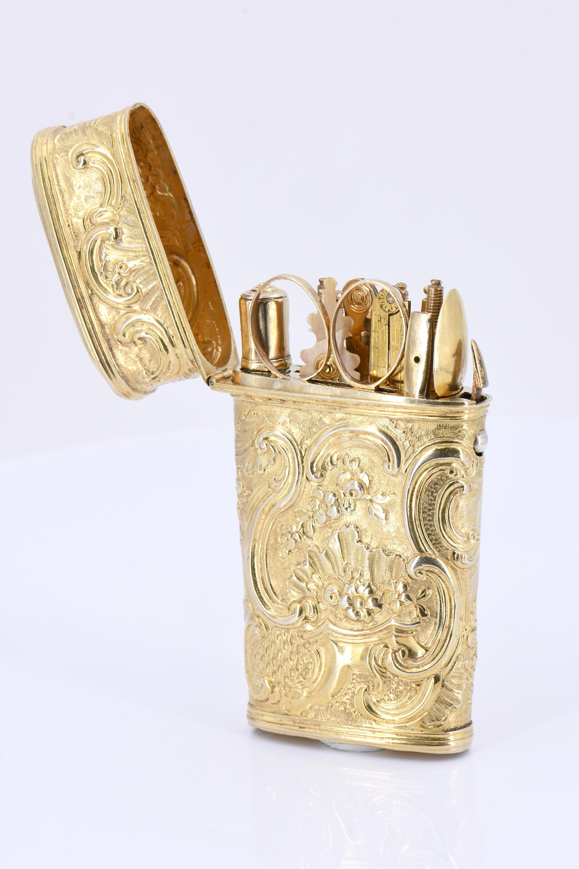 Beschreibung: Innen vollständig und original erhalten 13 kleine Utensilien: Schere, Zollstock, Löffel,