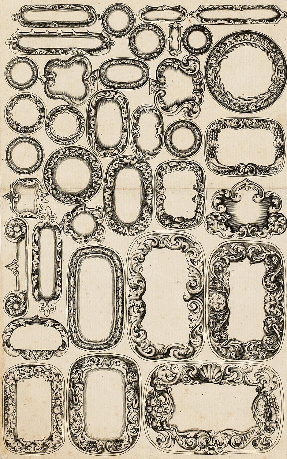 Vorlagenblatt für kleine Rahmen oder Beschläge. Kupferstich auf Papier. 19,8 x 32,3cm.