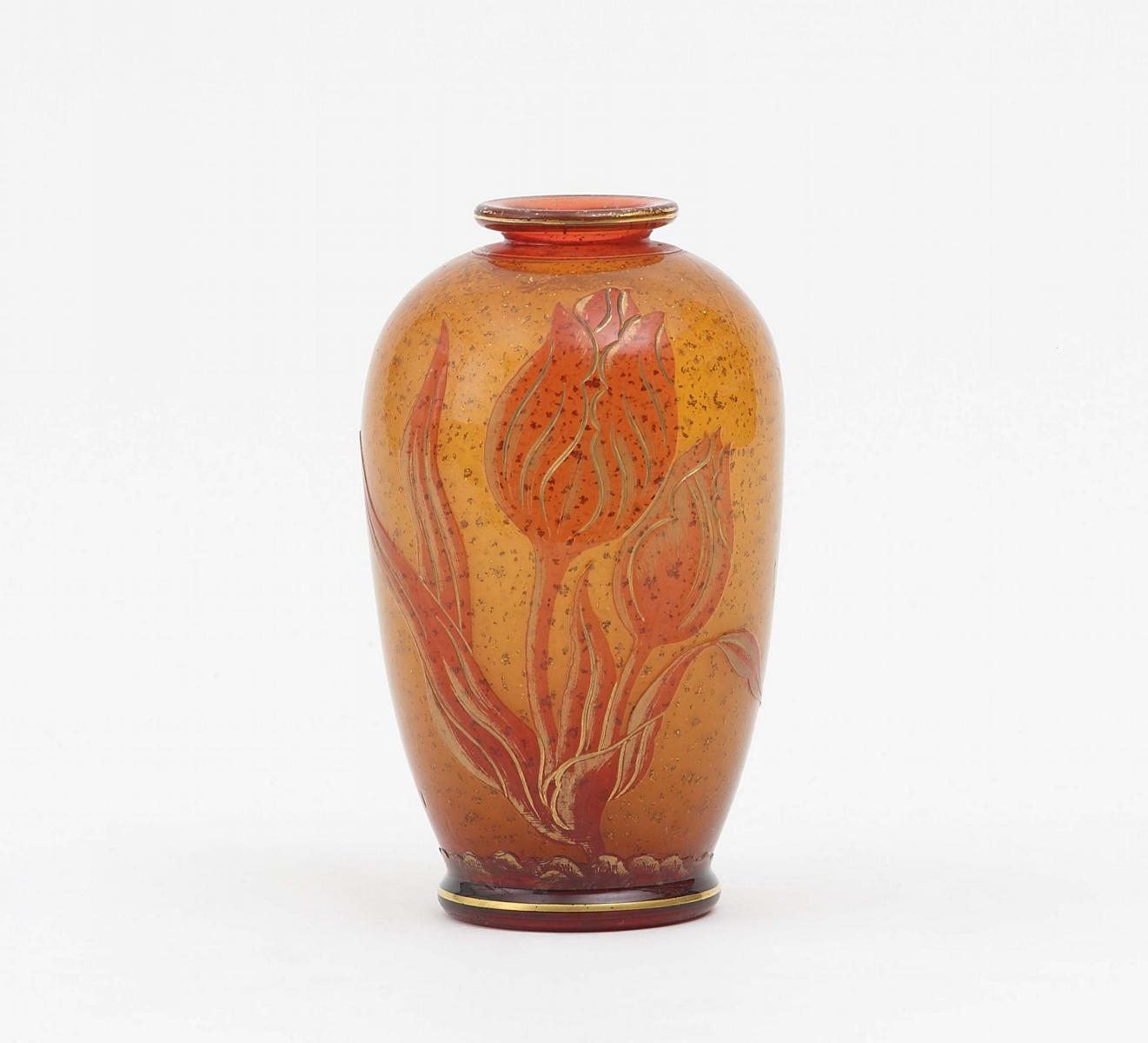 Orangefarbenes Glas mit Metallglittereinschlüssen. Überfang in Orange. Gold dekoriert. H.18 cm.