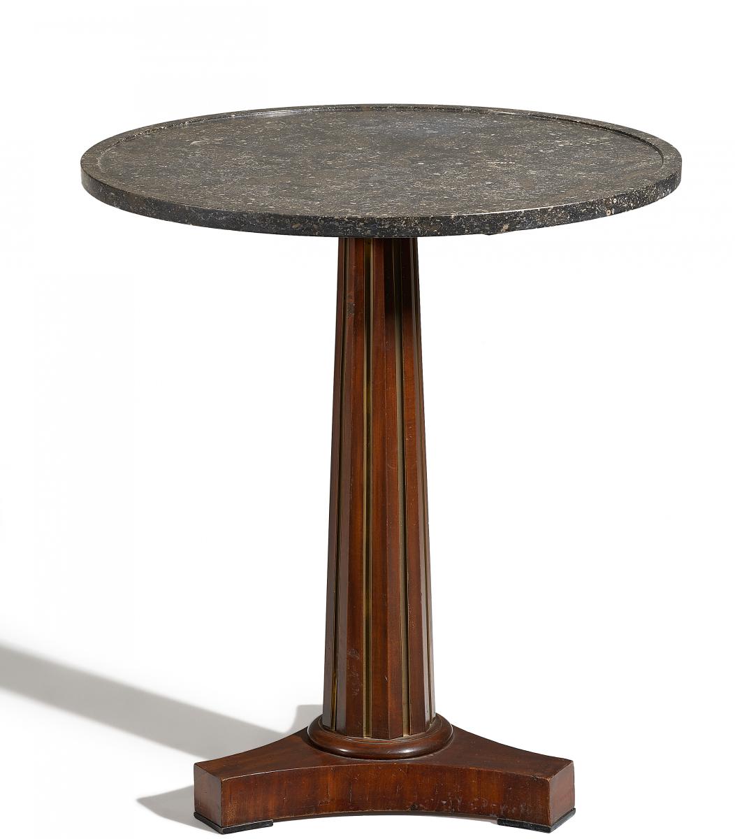 Mahagoni. Messingkanneluren. Marmorplatte. Runde Form. Höhe 72, + 65,5cm. Zustand B.