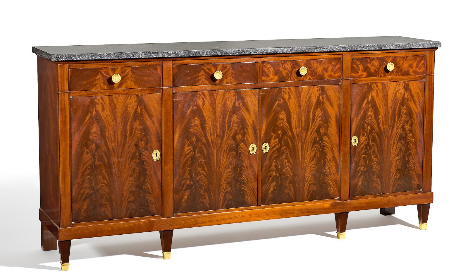 Mahagoni poliert. Vergoldete Beschläge. Marmorplatte. Geradliniger Korpus mit vier Türen und darüberliegenden Schubladen. 103x208x46cm. Zustand B.