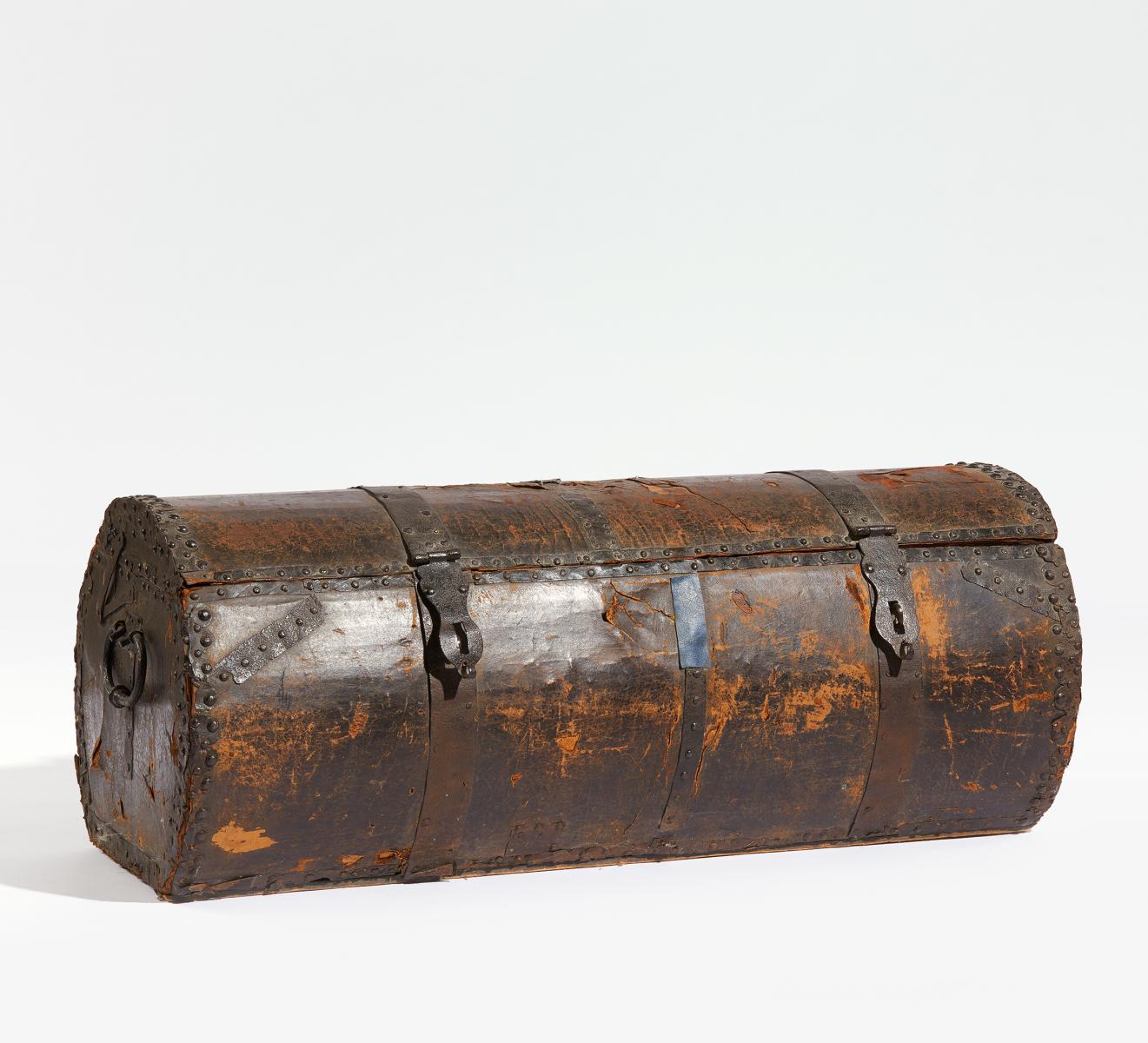 Technik: Holz mit Leder bespannt. Eisenbeschläge.
