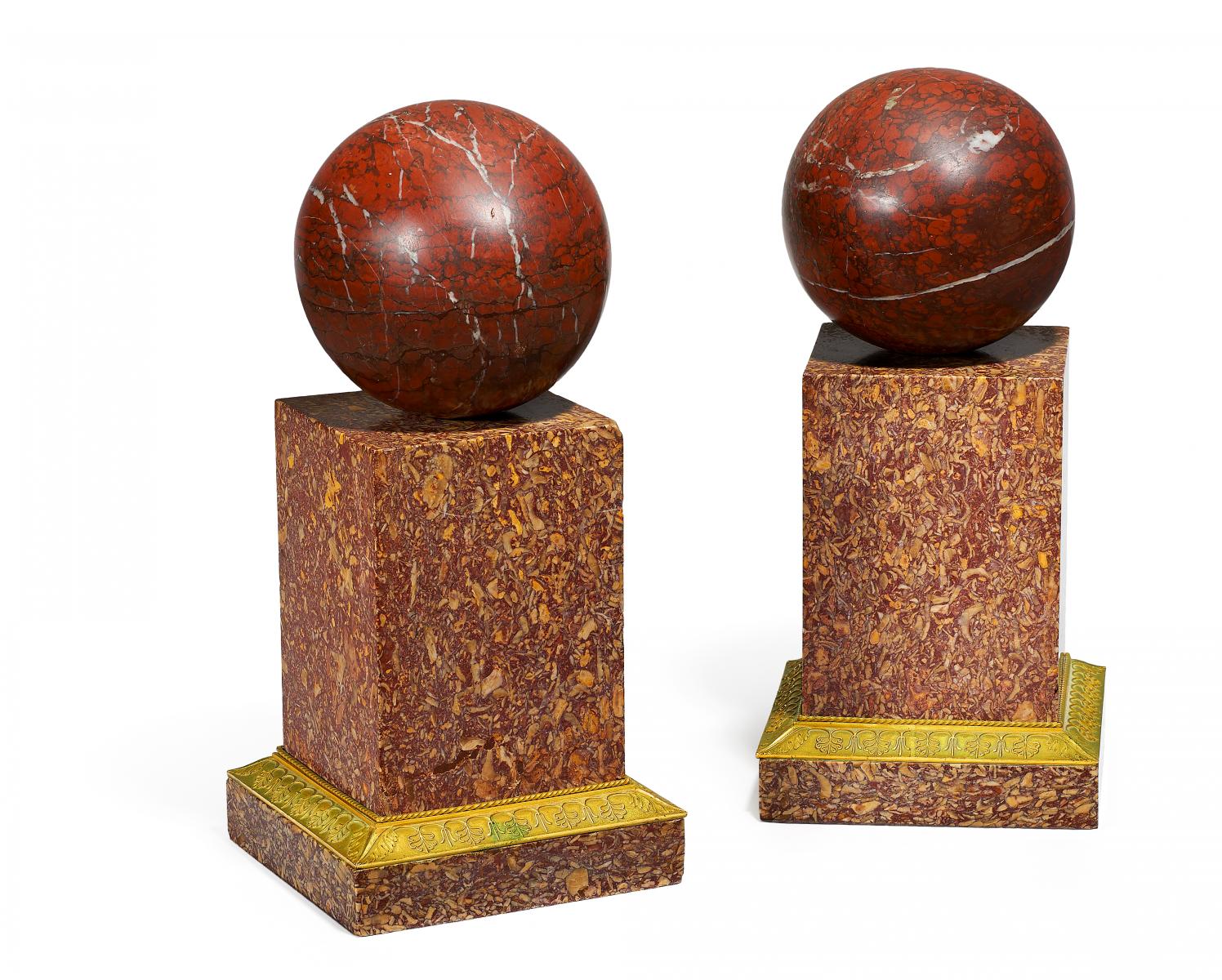 Roter Marmor. Vergoldete Bronze. Kugel auf gestuftem, quadratischem Sockel. Höhe 40,5cm. Zustand A/B.