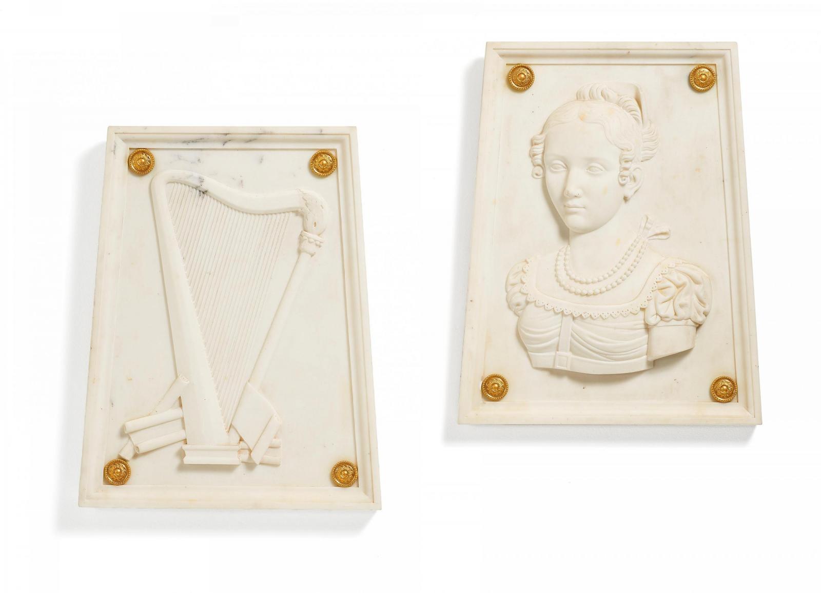 PAAR RELIEFS MIT VORNEHMER JUNGER DAME BZW. HARFE.