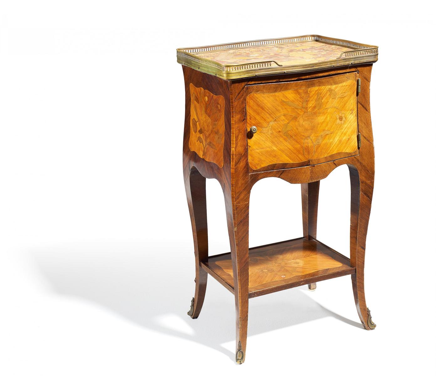 Technik: Edelhölzer poliert und eingelegt. Marmorplatte.