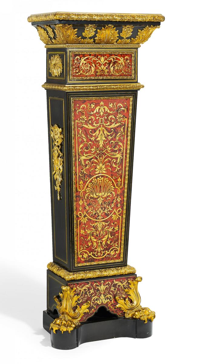 Boulle-Technik, Schildpatt und Messing ornamental eingelegt. Ebonisiertes Holz, vergoldete Bronzeapplikationen. Ausgeschnittener Sockel auf Klauenfüßen. Konischer Schaft. Hoher, geschwungener Abschluss