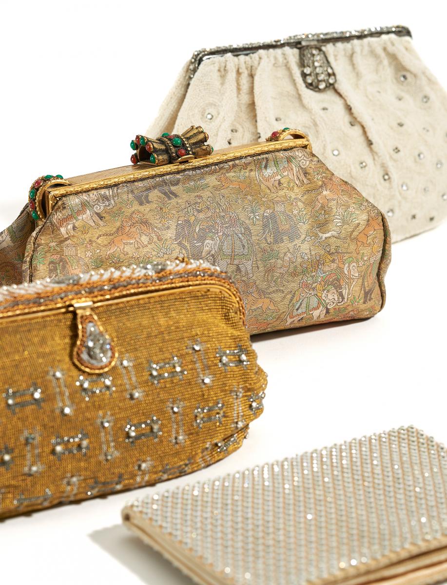 U.a. Seide, Perlstickerei, Metall vergoldet bzw. versilbert, Strass- und Farbsteine. Länge 17 - 23cm.