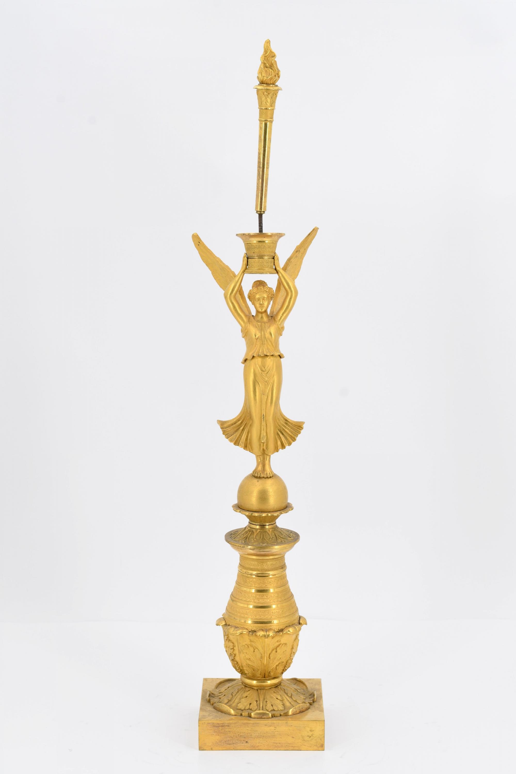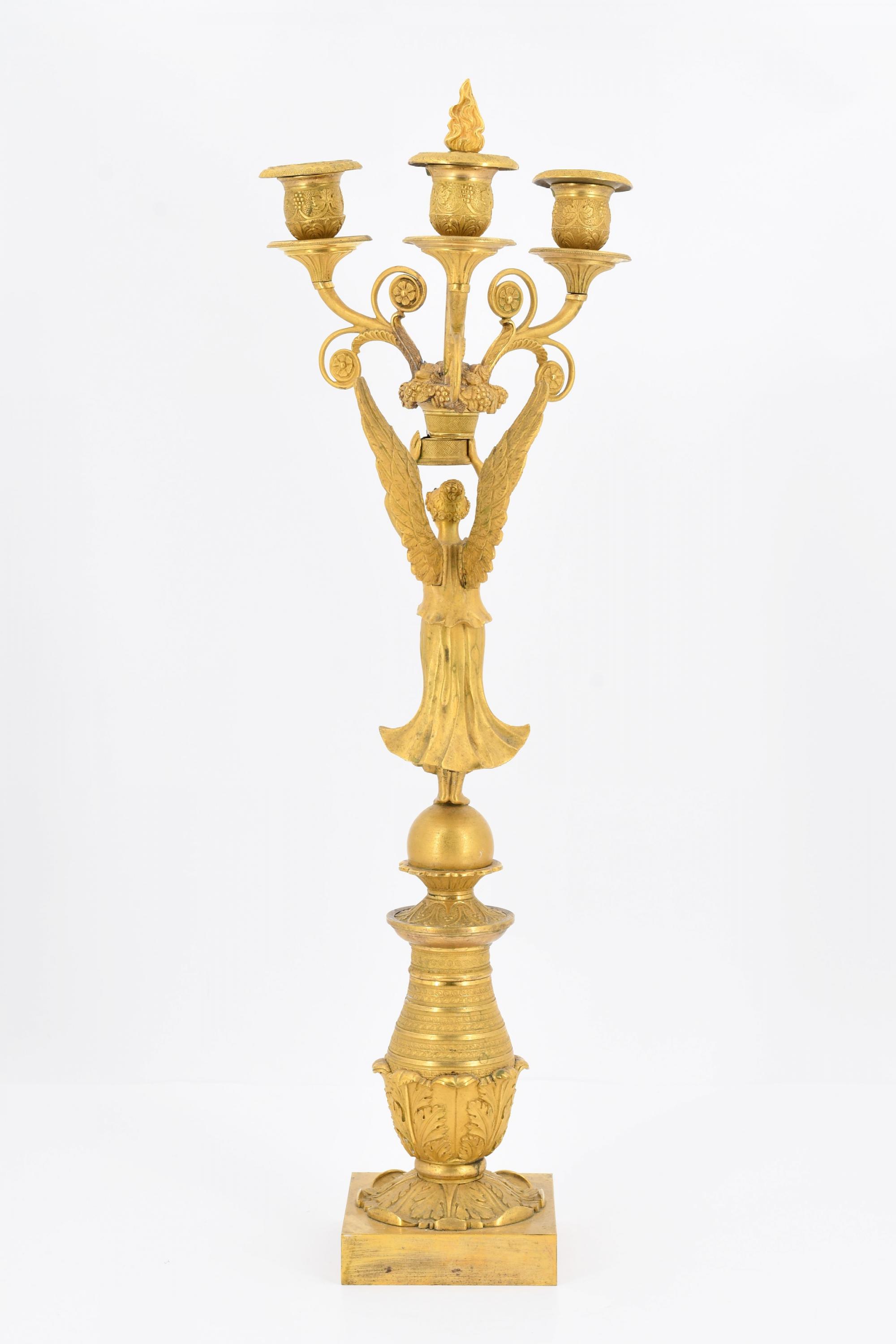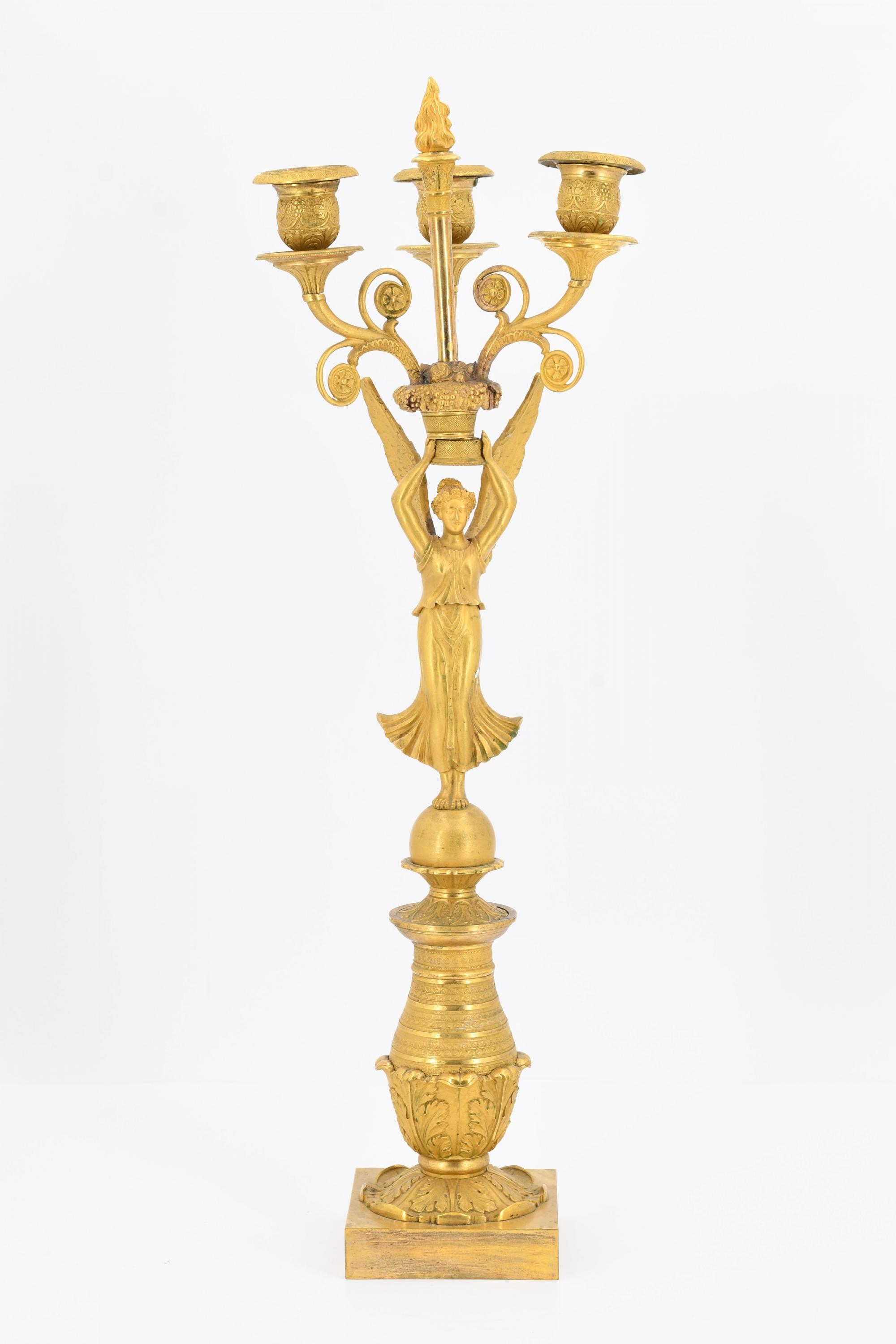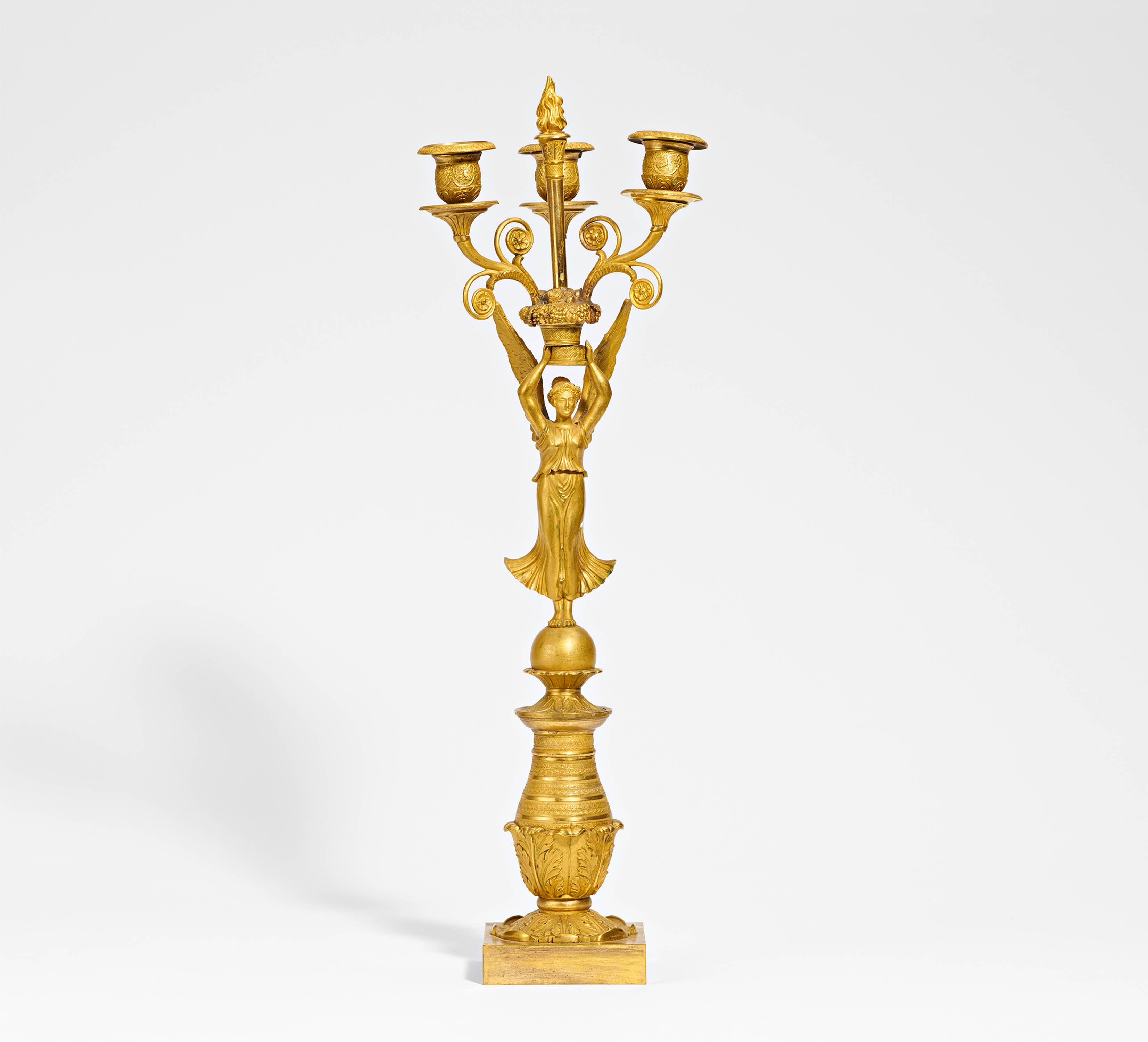 dreiflammigen Leuchteraufsatz über ihren Kopf haltend.