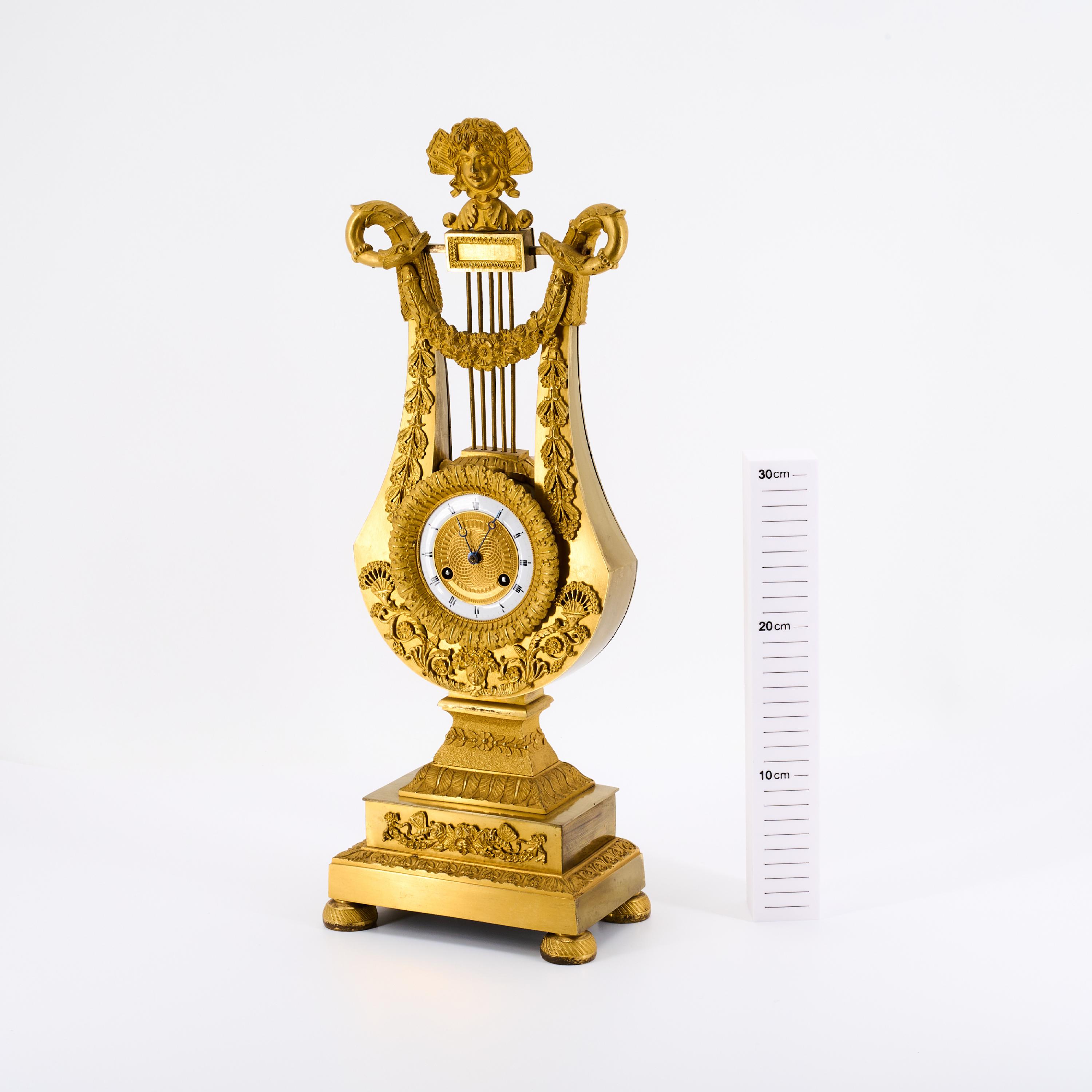 Beschreibung: Auf rechteckigem, zweifach gestuftem Sockel das Gehäuse in Form einer Lyra mit aufgelegten