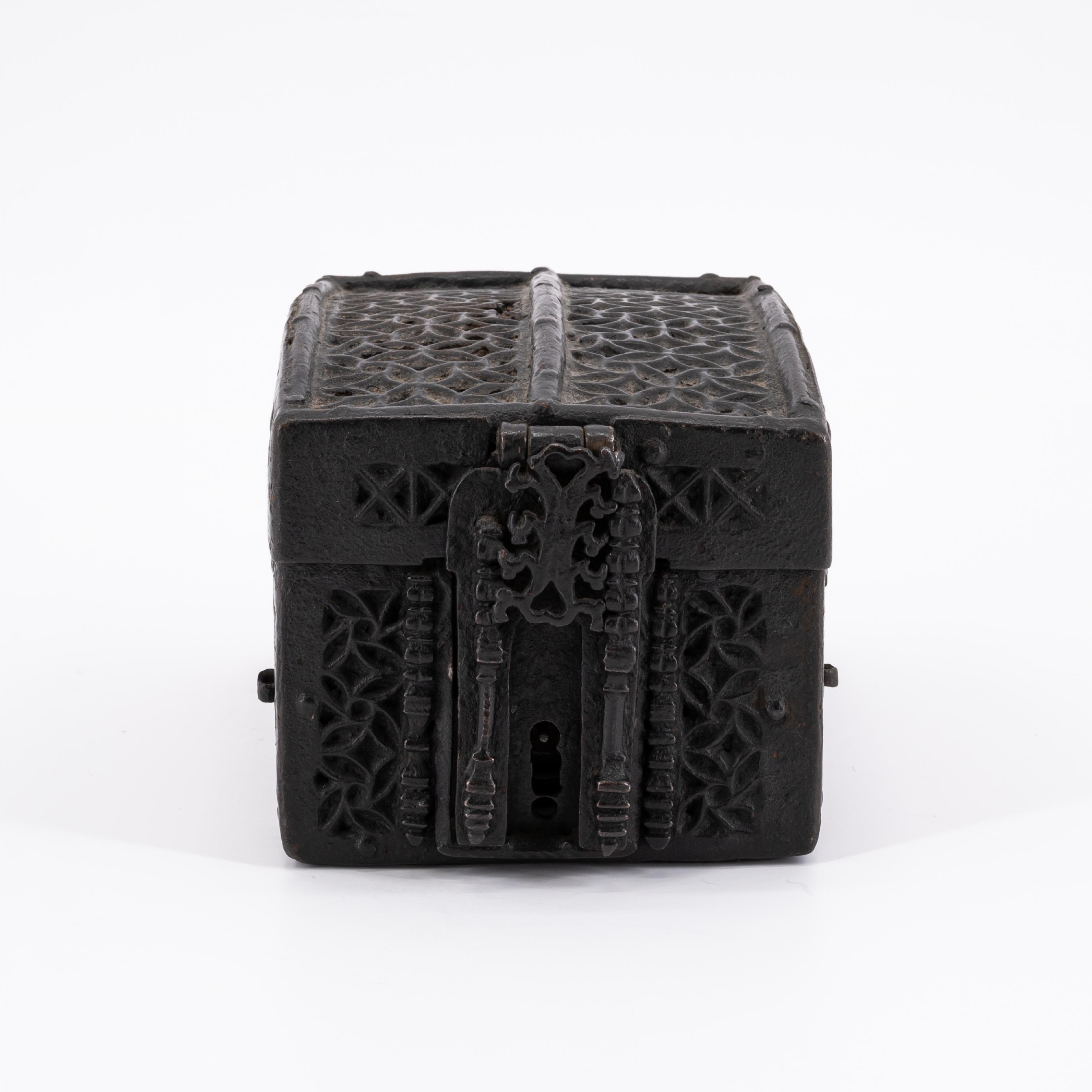 Scharnier an der Schmalseite. Die Eisenmontierung wie ein Netz fein in maßwerkartige