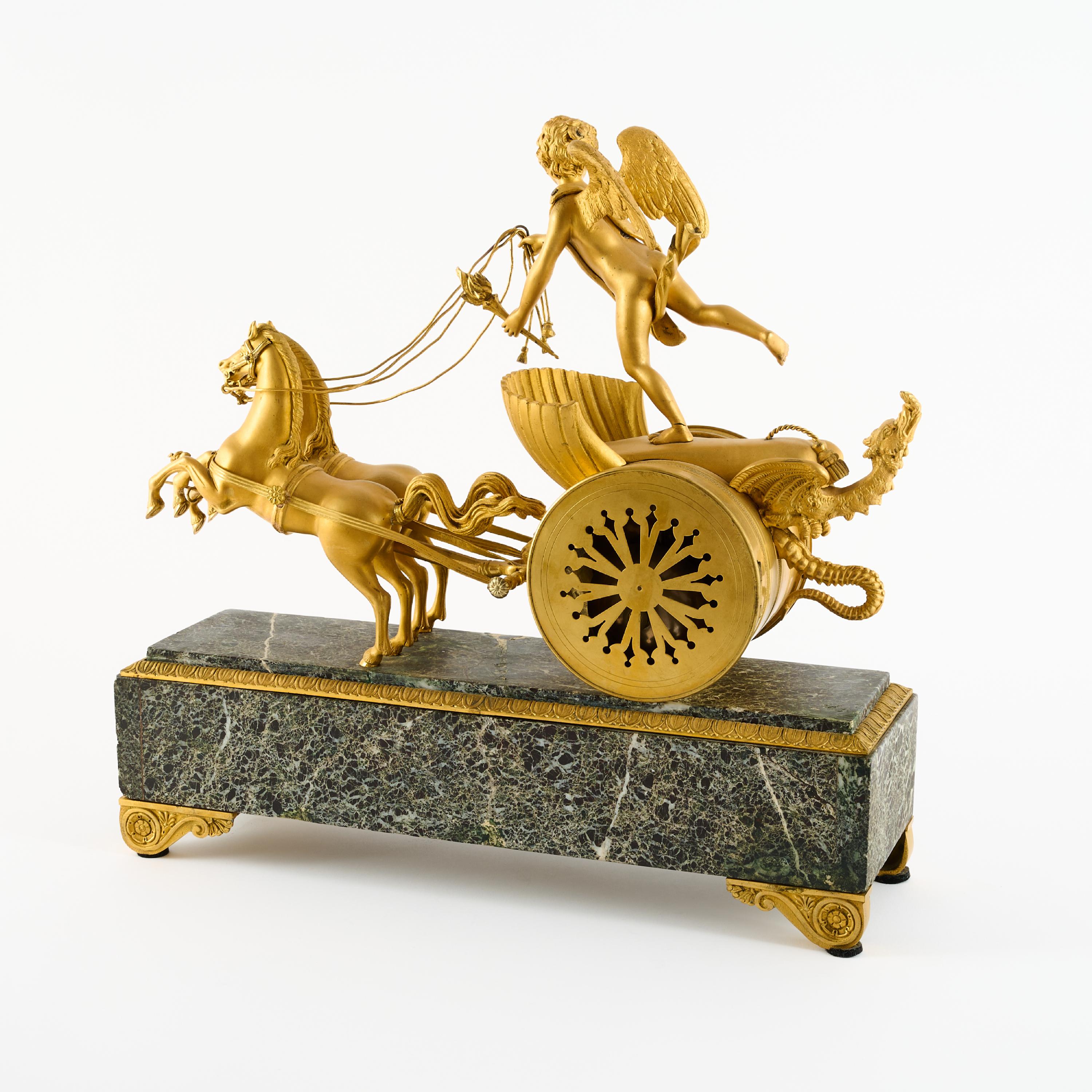 Applikationen. Darauf Amor auf einem zweispännigen Wagen, das Rad als Uhrgehäuse