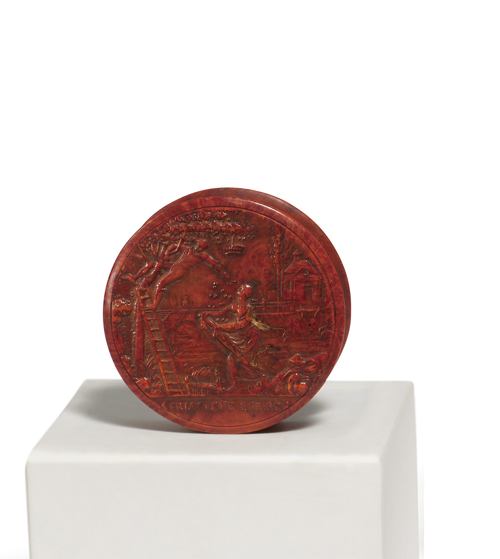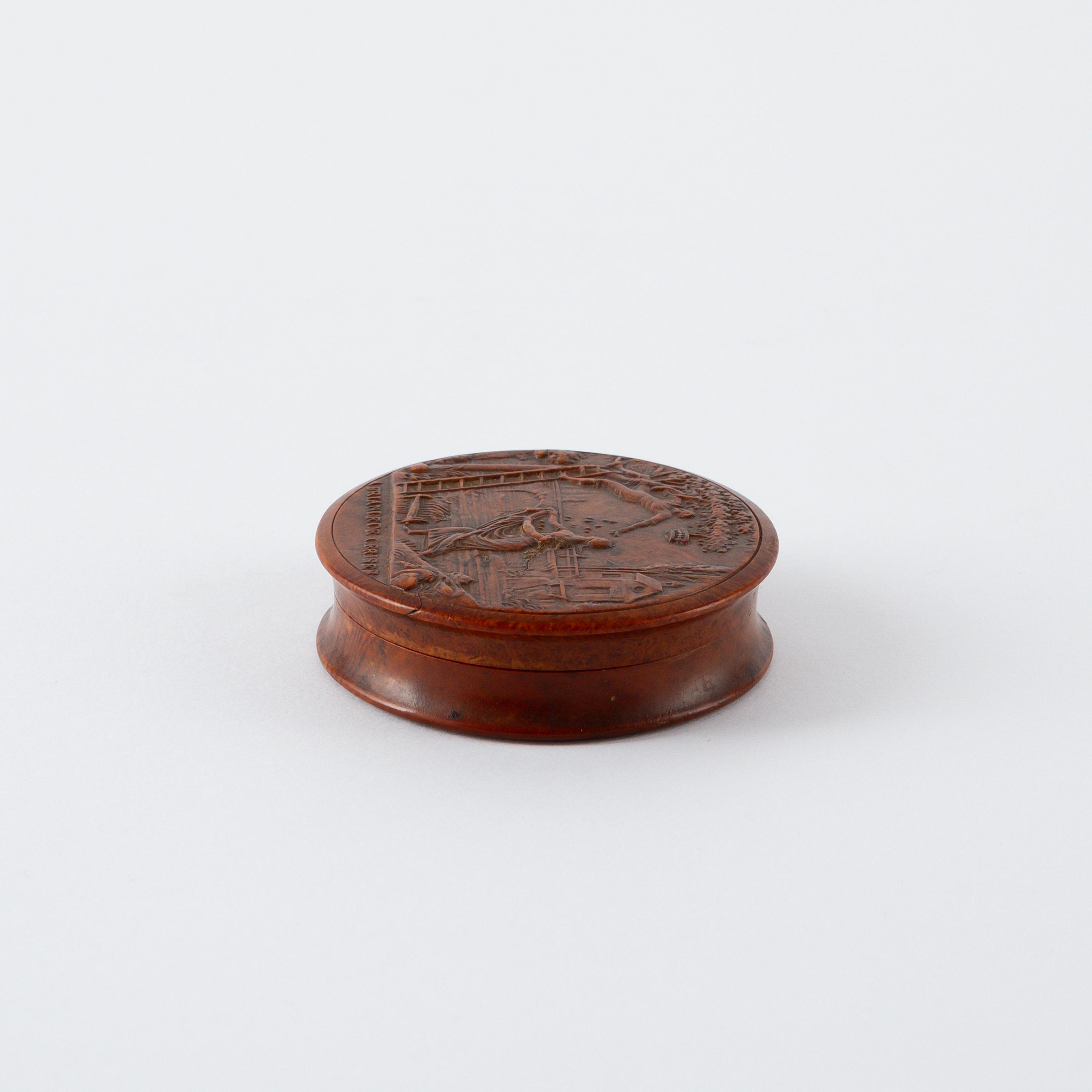Technik: Wurzelholz geschnitzt, innen Schildpatt.