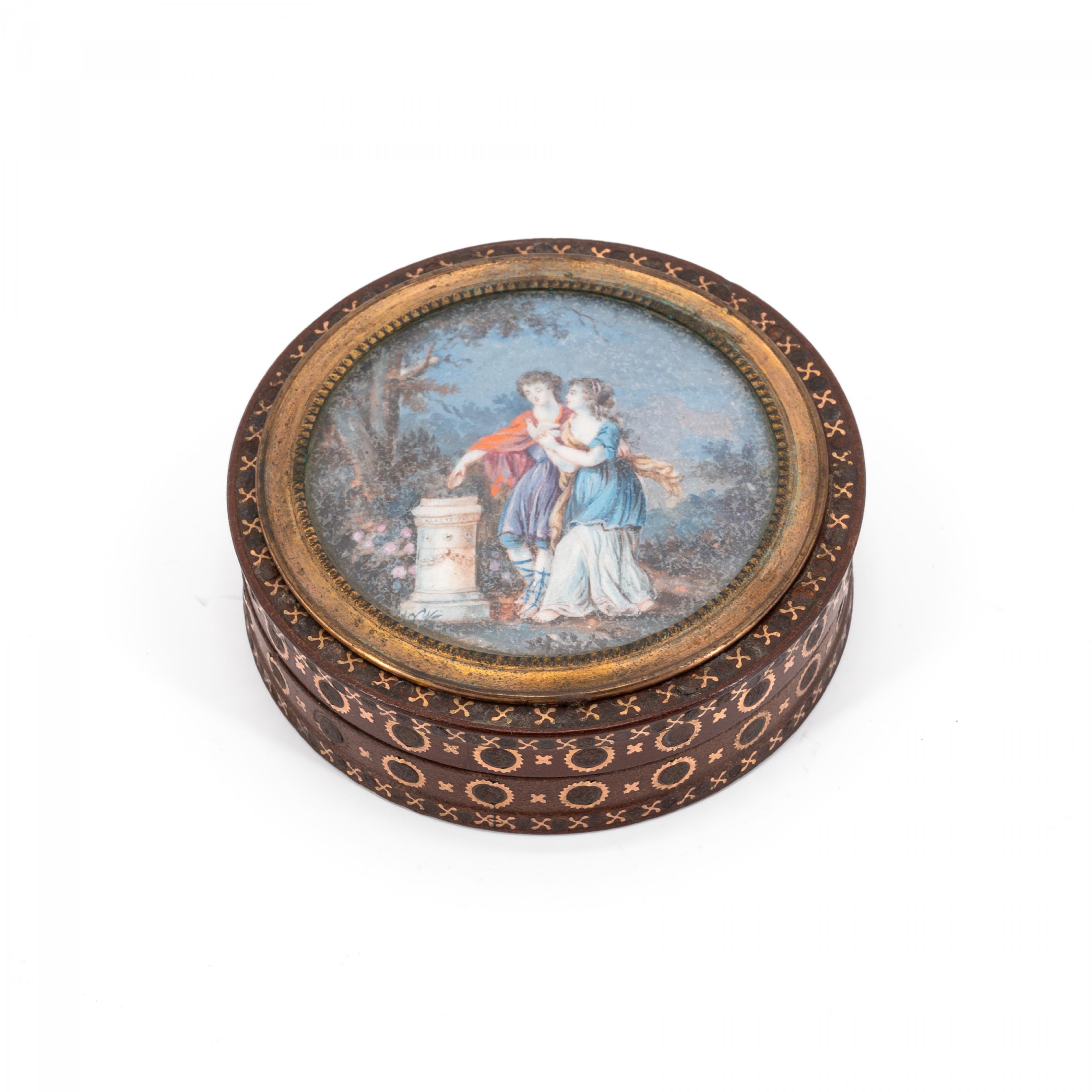 RUNDE DOSE MIT PAAR IN PARKLANDSCHAFT.