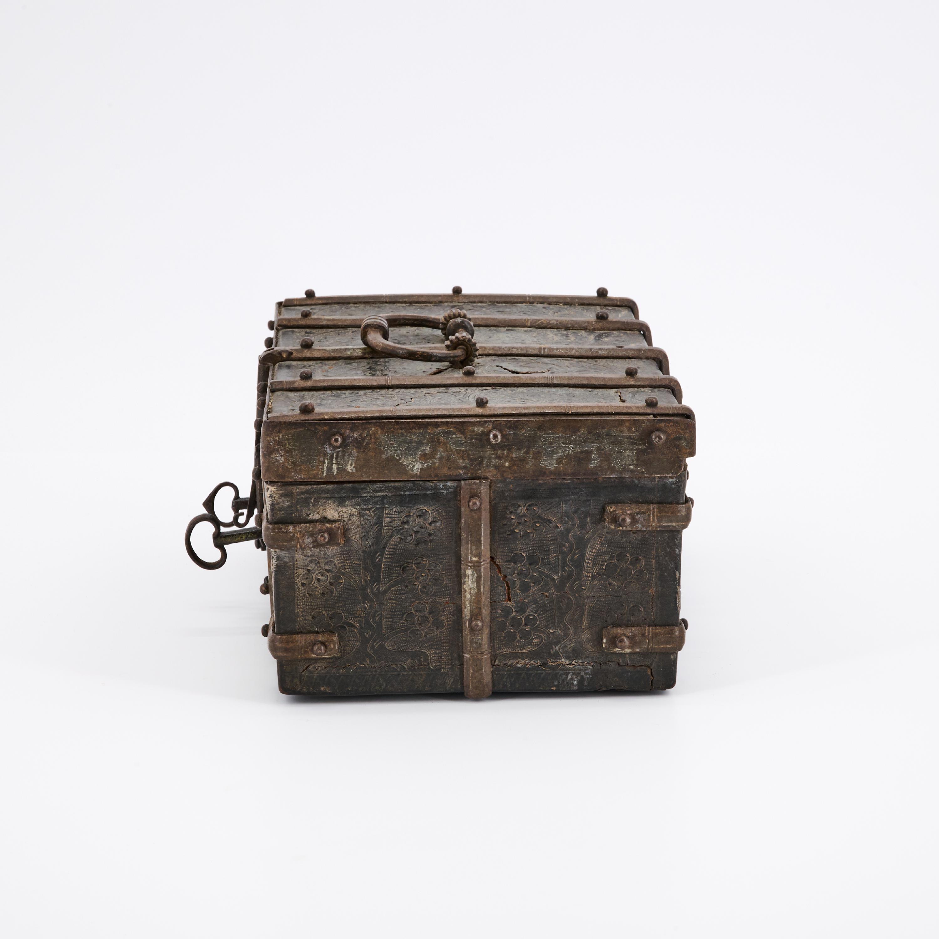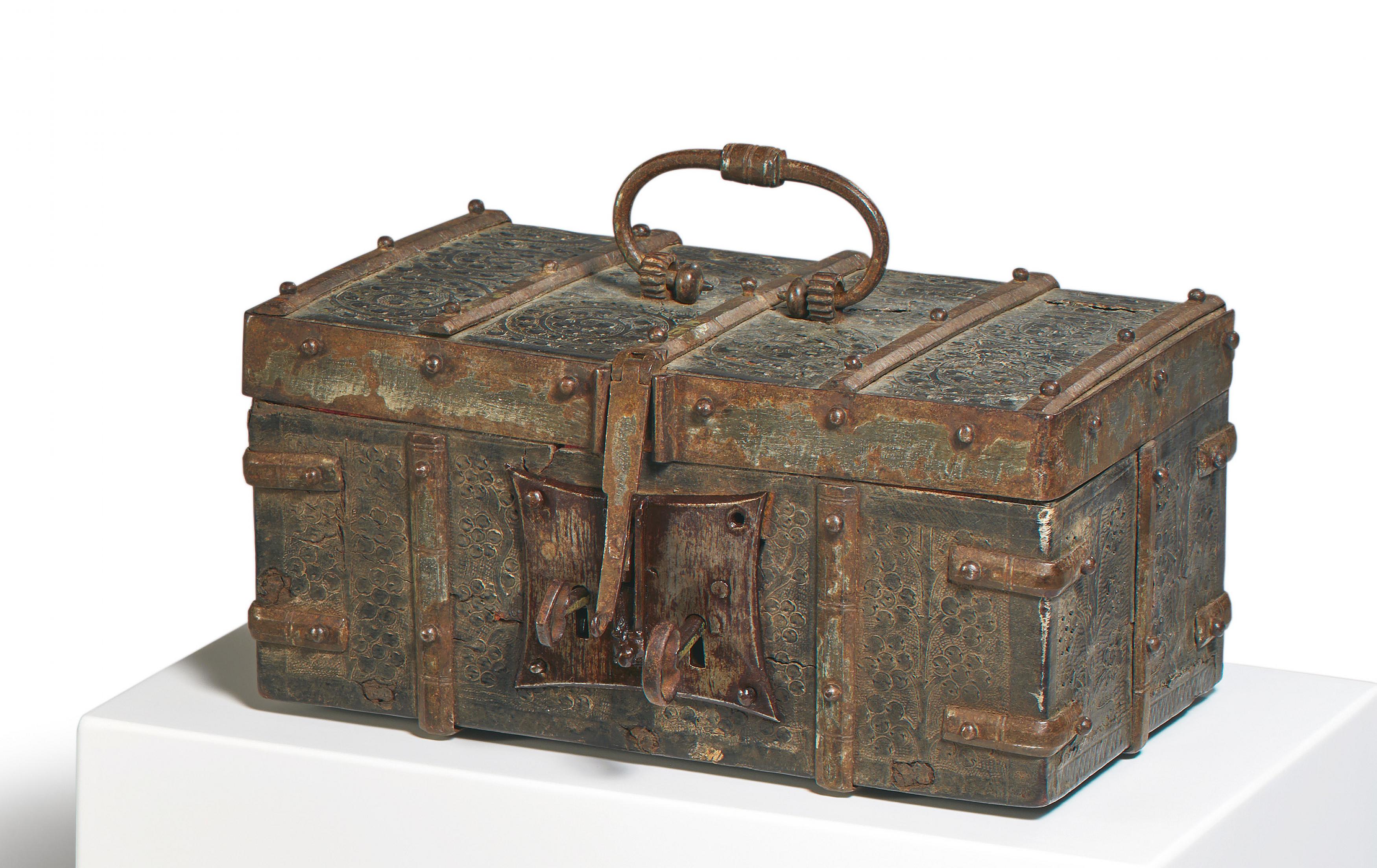 Eisenbänder mit kugelförmigen Nieten. Scharnierter Deckelgriff. Das Schloss mit einer