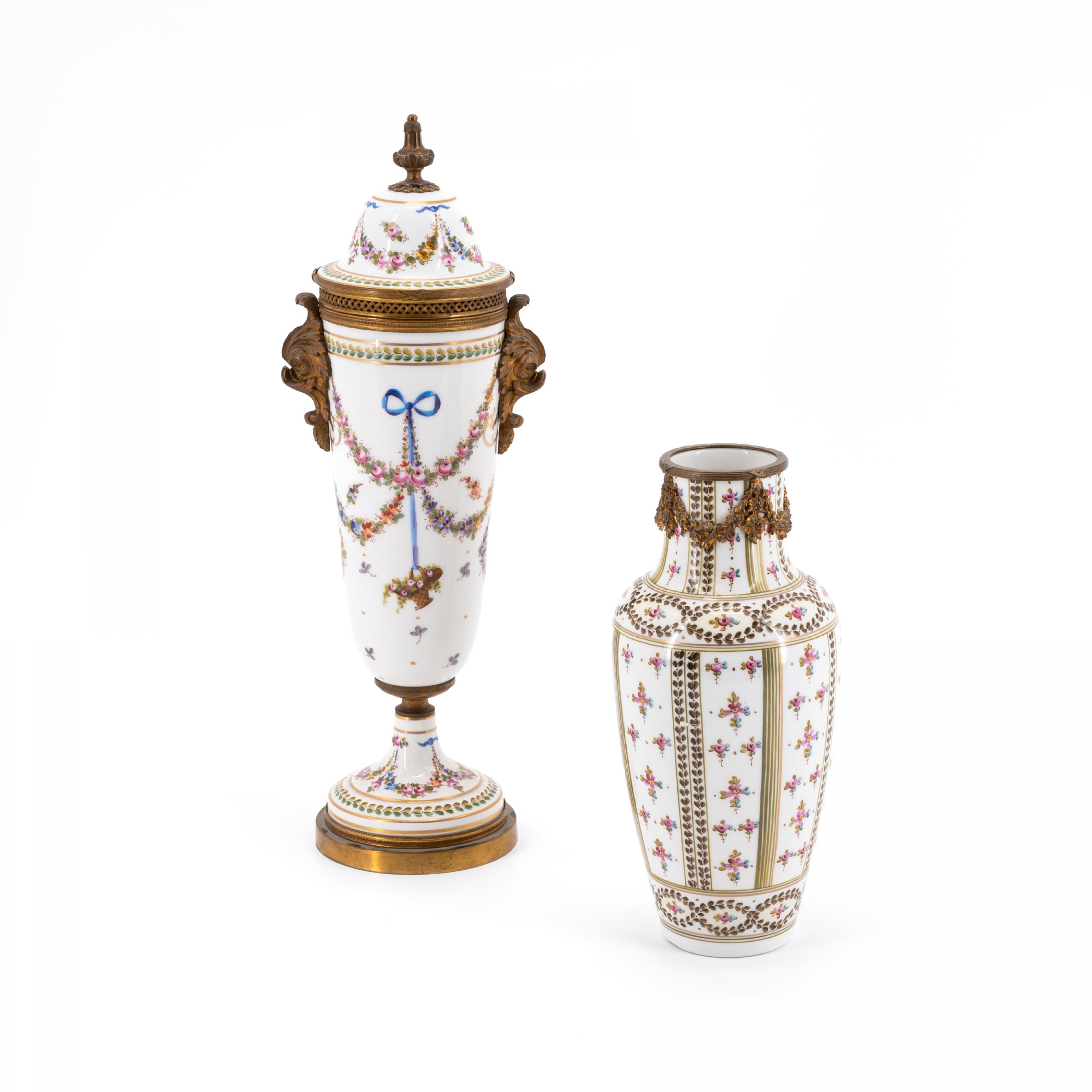 ZWEI KLEINE VASEN MIT BLUMENGIRLANDEN UND KLEINEN BLÜTEN.