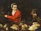 Titel: Küchenstillleben mit einer Frau in rotem Oberteil.