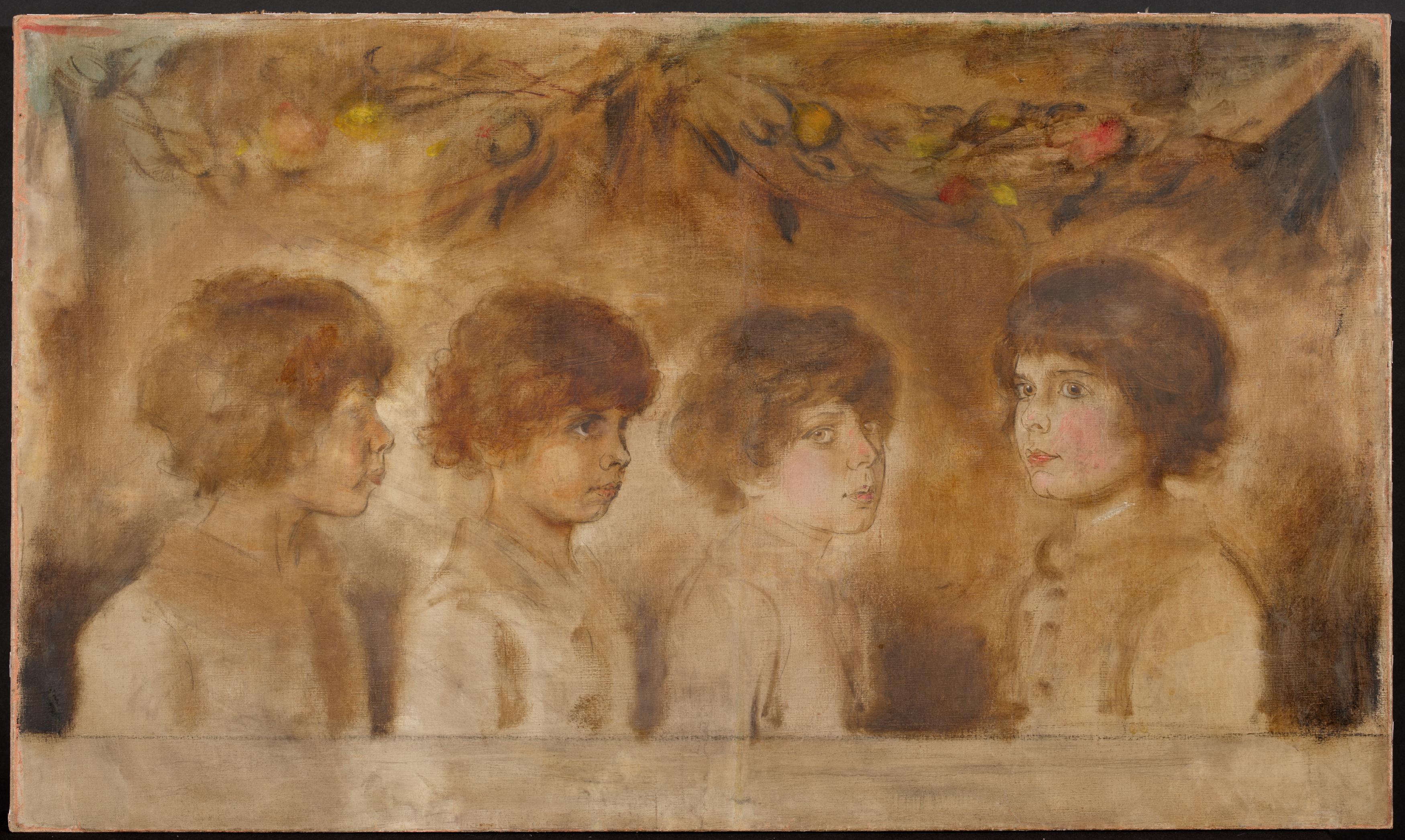 Eine gute Freundschaft verband im München des ausgehenden 19.Jhs. den Malerfürst Franz von Lenbach mit dem Mathematiker und Kunstsammler Alfred Pringsheim und dessen Frau Hedwig. Nachdem Lenbach 1891 die Tochter Katia zusammen mit der Mutter porträtiert hat, plant er ein Pendant mit den Söhnen und dem Vater, das Hedwig in ihrem Tagebuch erwähnt (vgl. Literatur). Leider kommt es nicht zur Ausführung des Gruppenporträts; die Entwurfsstudien haben die Zeit eingerollt im Nachlass des Künstlers überdauert. Typisch für die Arbeitsweise Lenbachs ist, dass es zwar zu den im Tagebuch erwähnten Sitzungen im Atelier des Malers kommt, er aber nicht direkt vor dem Modell zeichnet. Während dieser Termine werden zunächst Fotos angefertigt, nach denen Lenbach dann seine Studien auf Karton oder Leinwand anfertigt und anschließend in Öl ausführt.