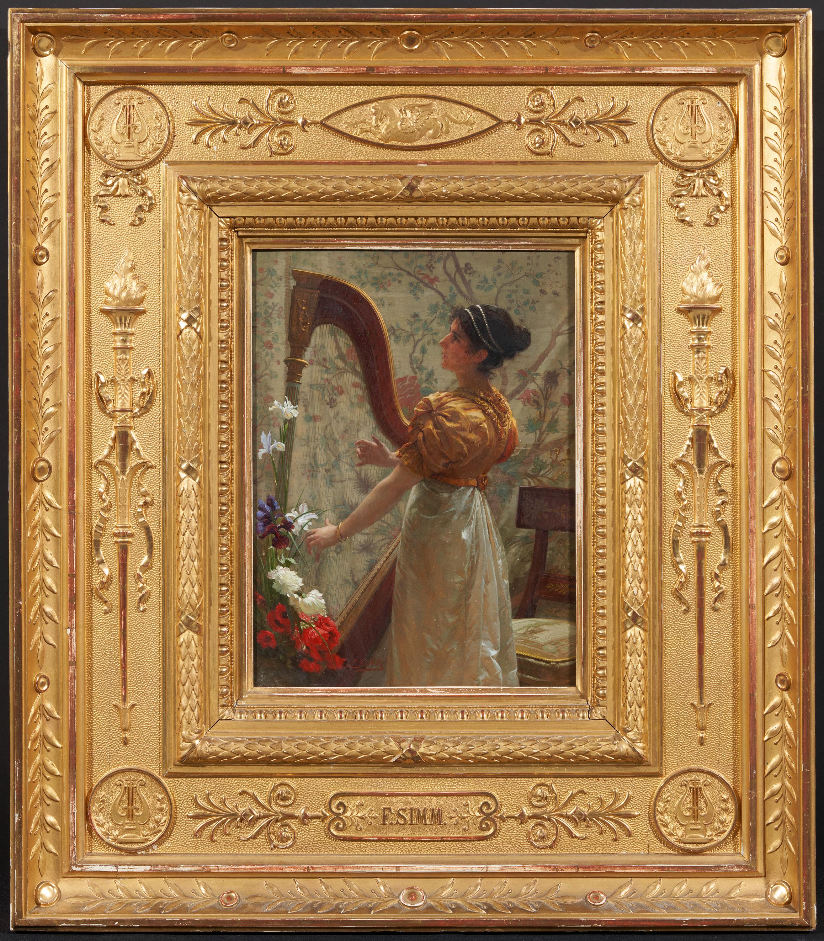 Franz Xaver Simm, geboren in Wien, hat dort bei Anselm Feuerbach studiert und ist nach Aufenthalten in Rom und Tiflis zusammen mit seiner Frau, die ebenfalls Malerin war, in München ansässig geworden. Dort machte er sich schnell einen Namen durch seine kleinformatigen Genredarstellungen, die sich stilistisch am Empire orientieren, dieser Spielart des Klassizismus, die nicht nur für die Innenarchitektur prägend war. Die Kombination seiner ausgezeichneten und detailreichen Malkultur zusammen mit dem prächtigen geschnitzten Goldrahmen von nicht minderer Qualität harmonieren und beeindrucken bei der Harfenspielerin in besonderer Weise.