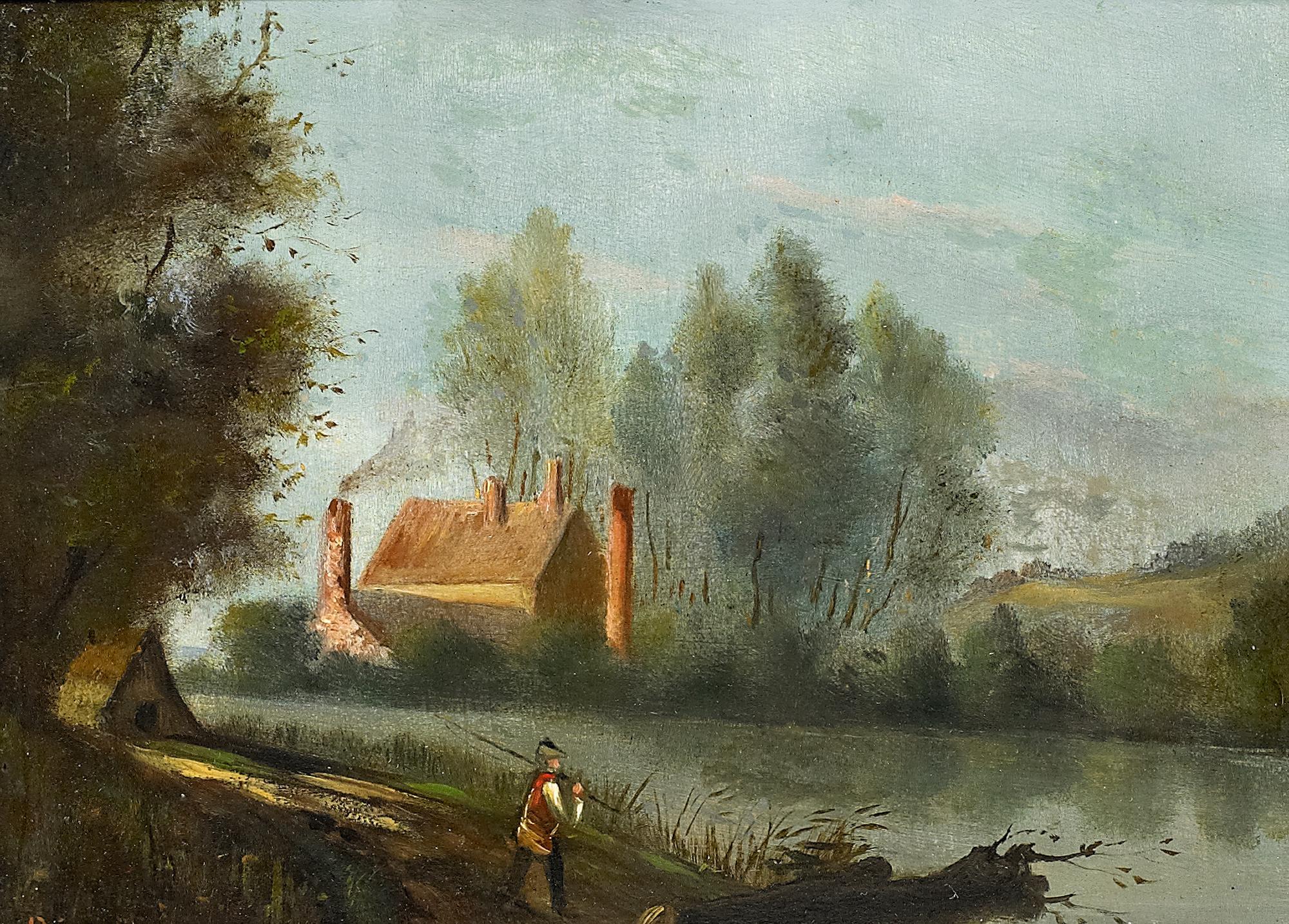 Angler am Kanal. Unten links: A. Bina. Öl auf Holz. 16,5 x 22cm. Rahmen.