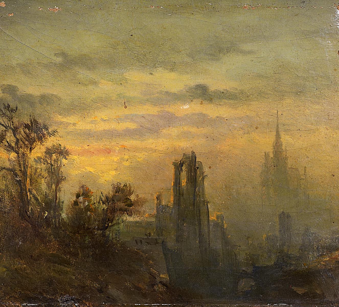 Landschaft mit Ruinen. Öl auf Leinwand. 19 x 21,5cm. Rahmen.