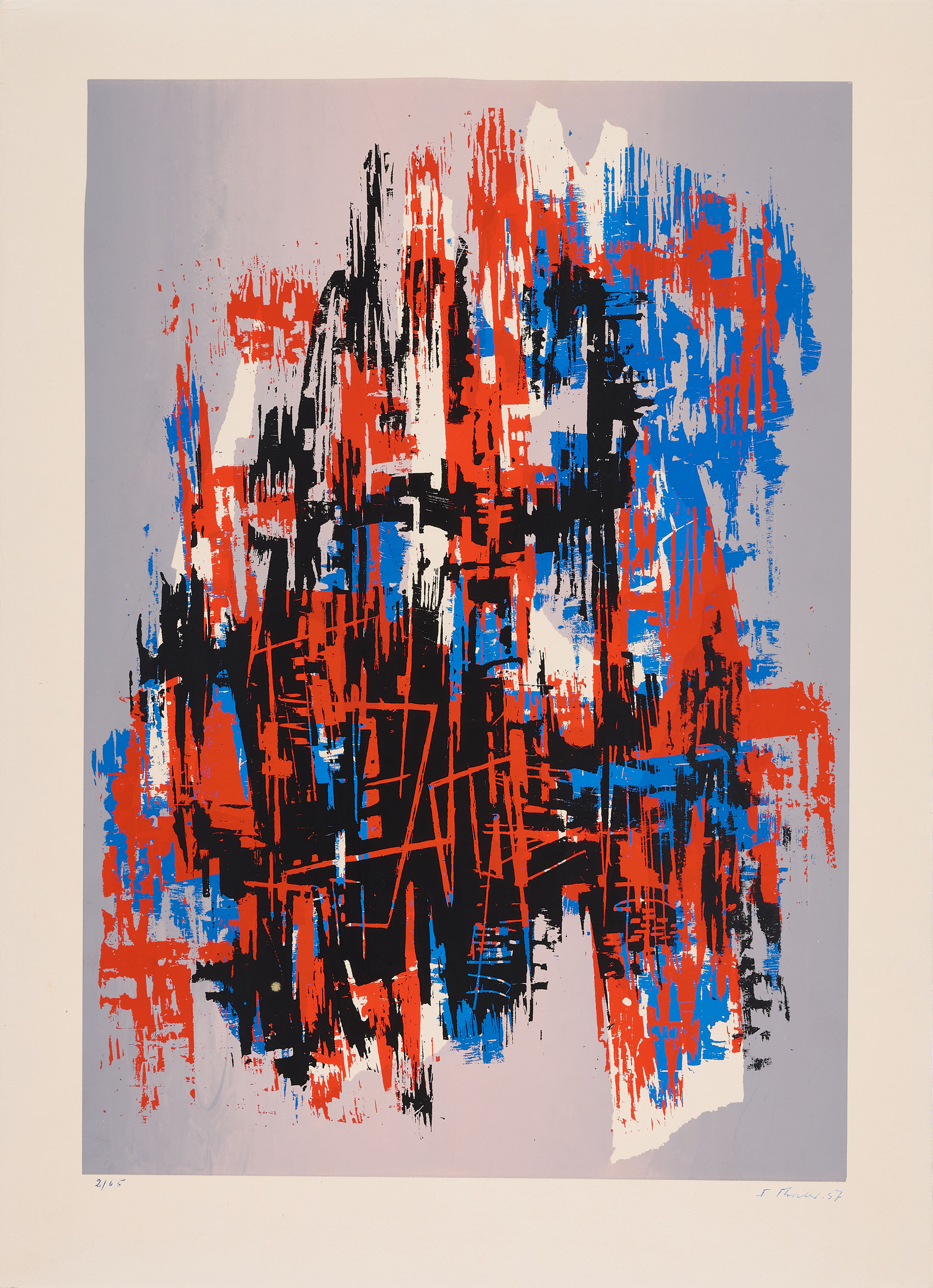 a) S.VI 57. 1957. Farbserigrafie auf grauem Bütten. 50 x 35cm (59 x 43cm). Signiert,