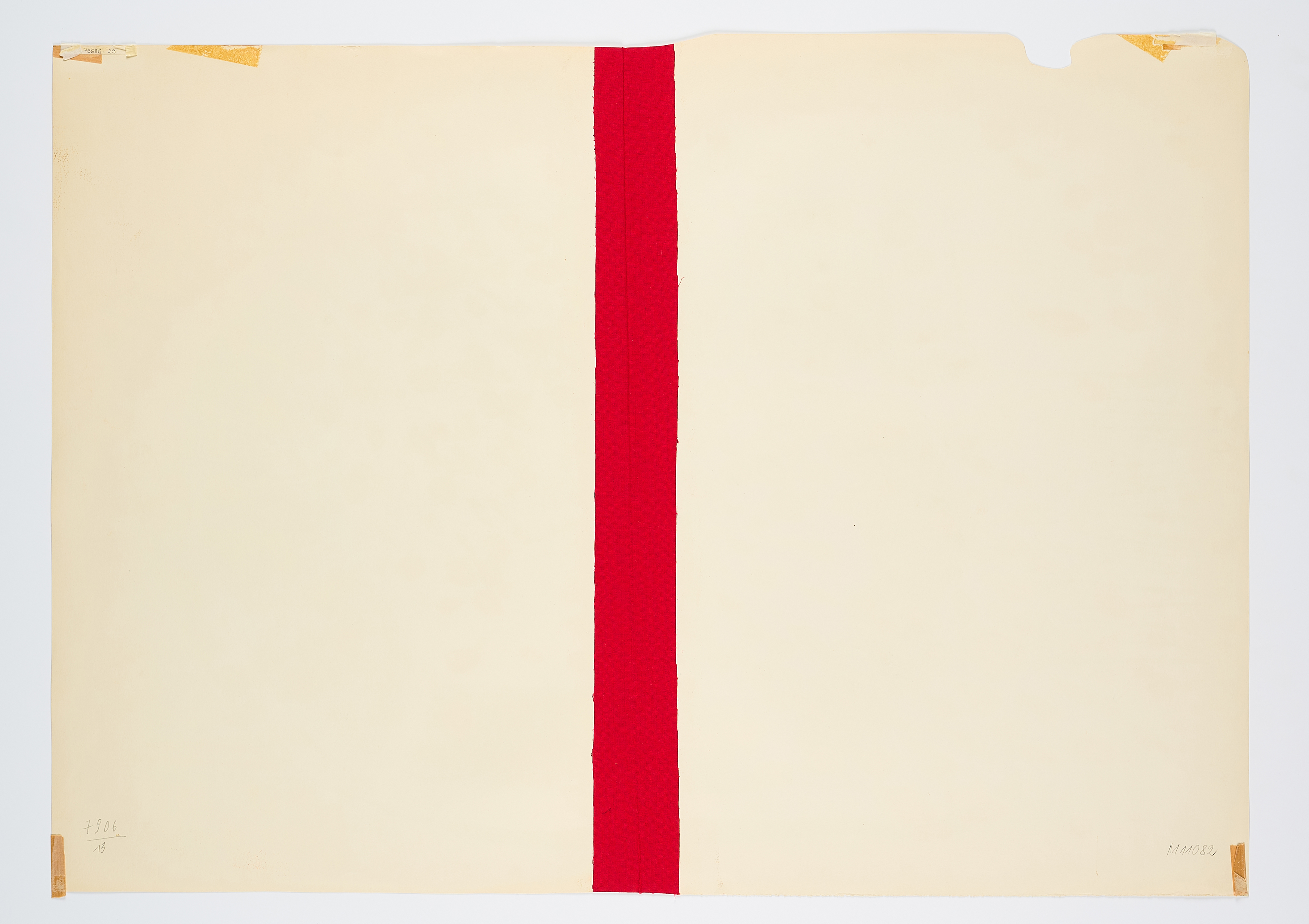 Technik: Farblithografie auf zwei mit rotem Stoffstreifen aneinandergefügten Blättern Velin.
