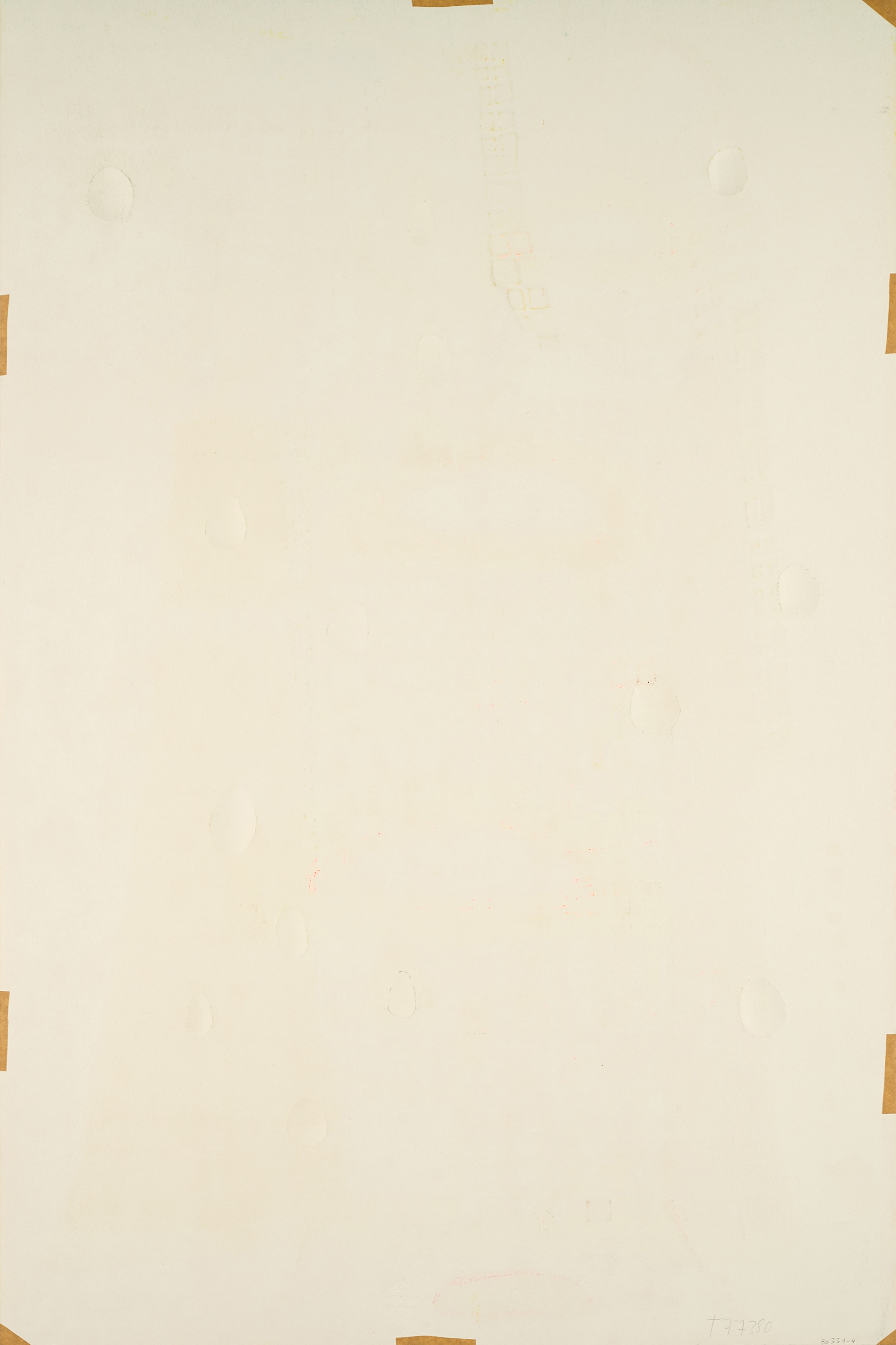 Blatt möglicherweise beschnitten um ca. 1cm in der Höhe. Minimale Bereibungen der erhabenen Metallprägungen. Minimal gebräunt. Minimale Verschmutzungen entlang der Kanten. Vereinzelt minimale Bestoßungen an den Kanten. Verso Reste alter Montierung und minimale Verschmutzungen. Ansonsten guter Zustand.