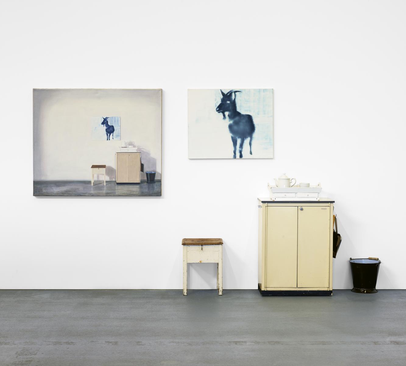 Es handelt sich bei dem Werk um eine Installation von Friederike Walter, die das Gemälde "Ziege" von Dieter Mammel mit Utensilien aus ihrem Atelier kombiniert, welche dann wiederum auf einem Gemälde Walters wiedergegeben wird.