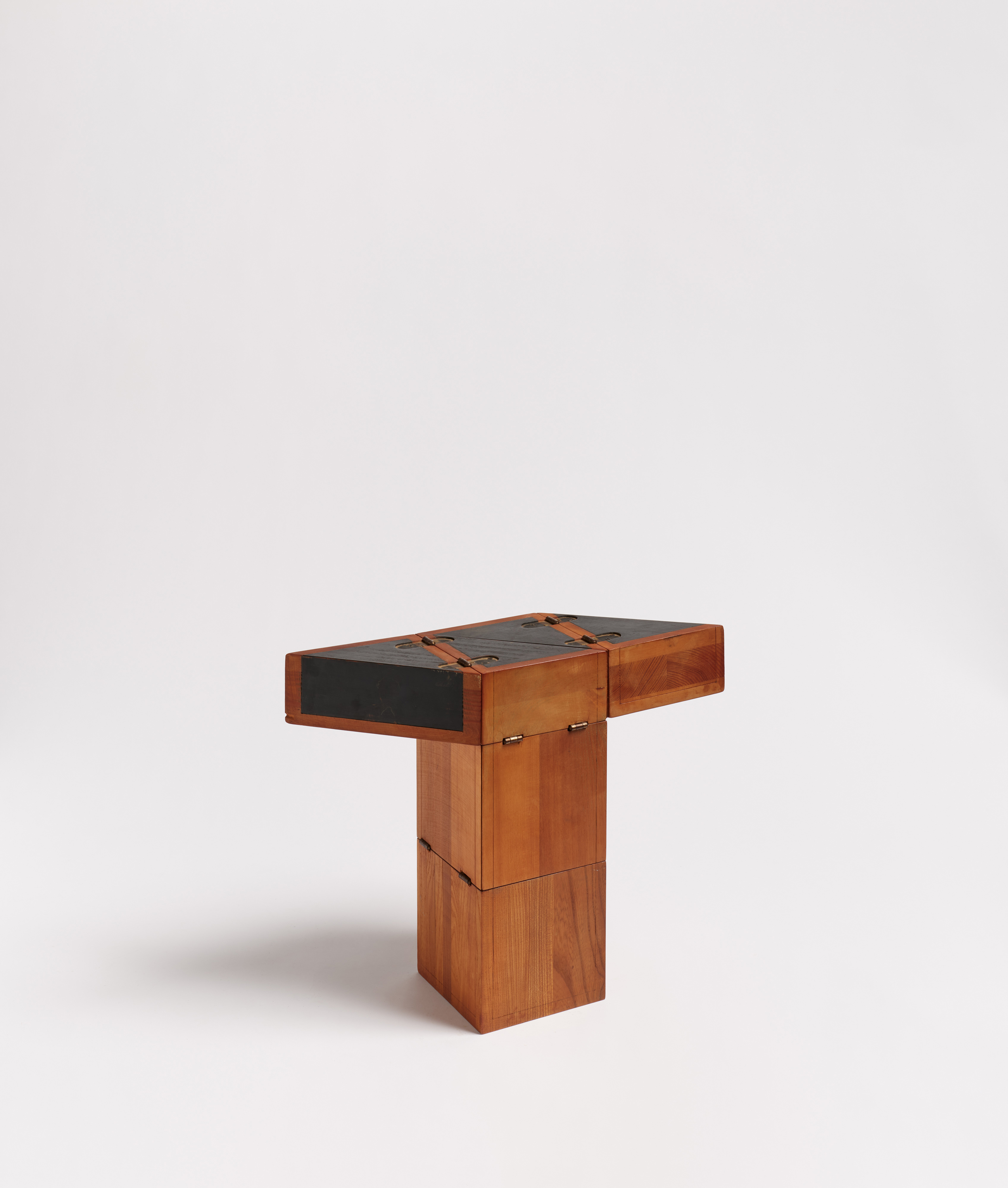Technik: Holz, geölt und schwarz markiert, mit Scharnieren verbunden.