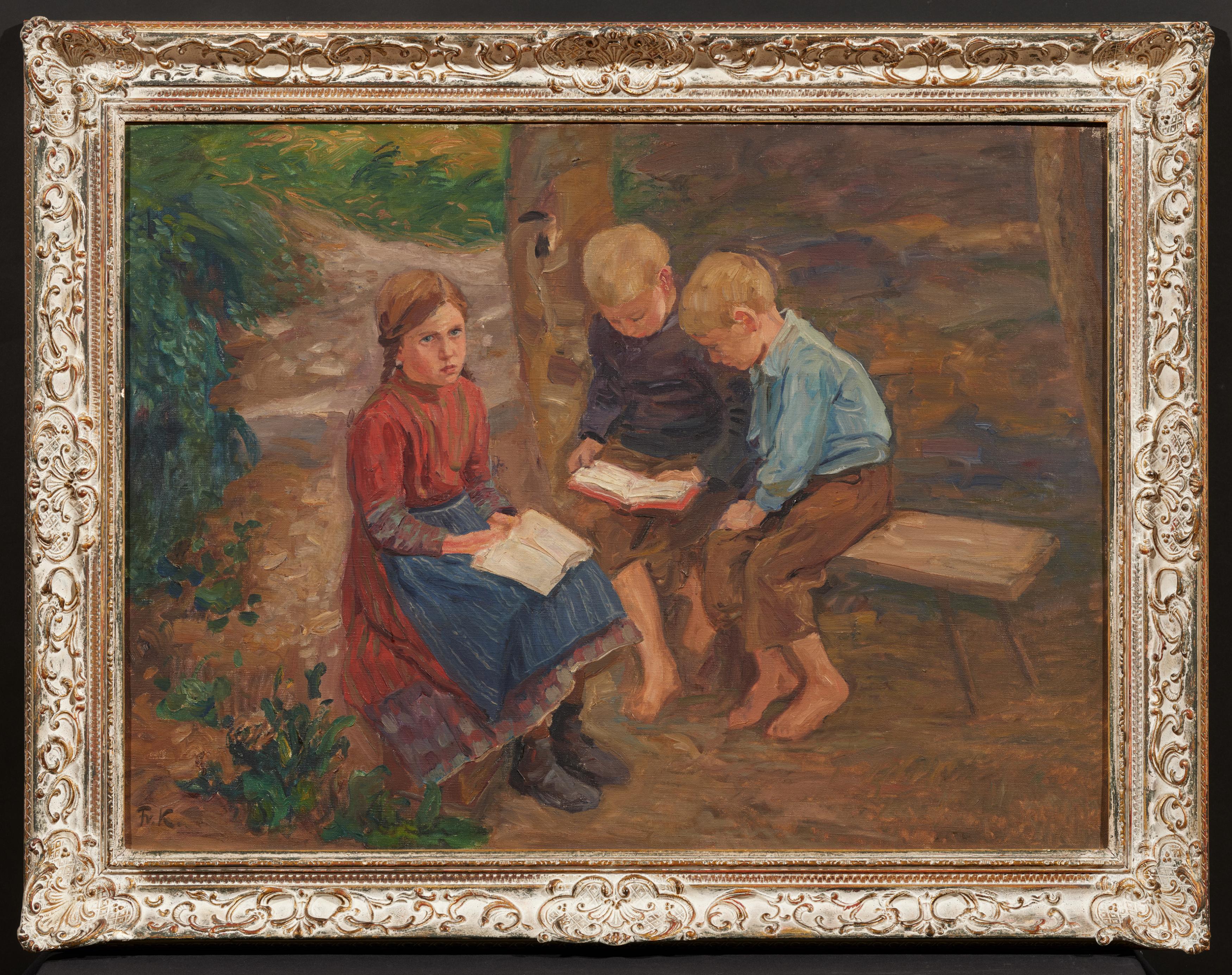 Titel: Lesende Kinder im Garten.
