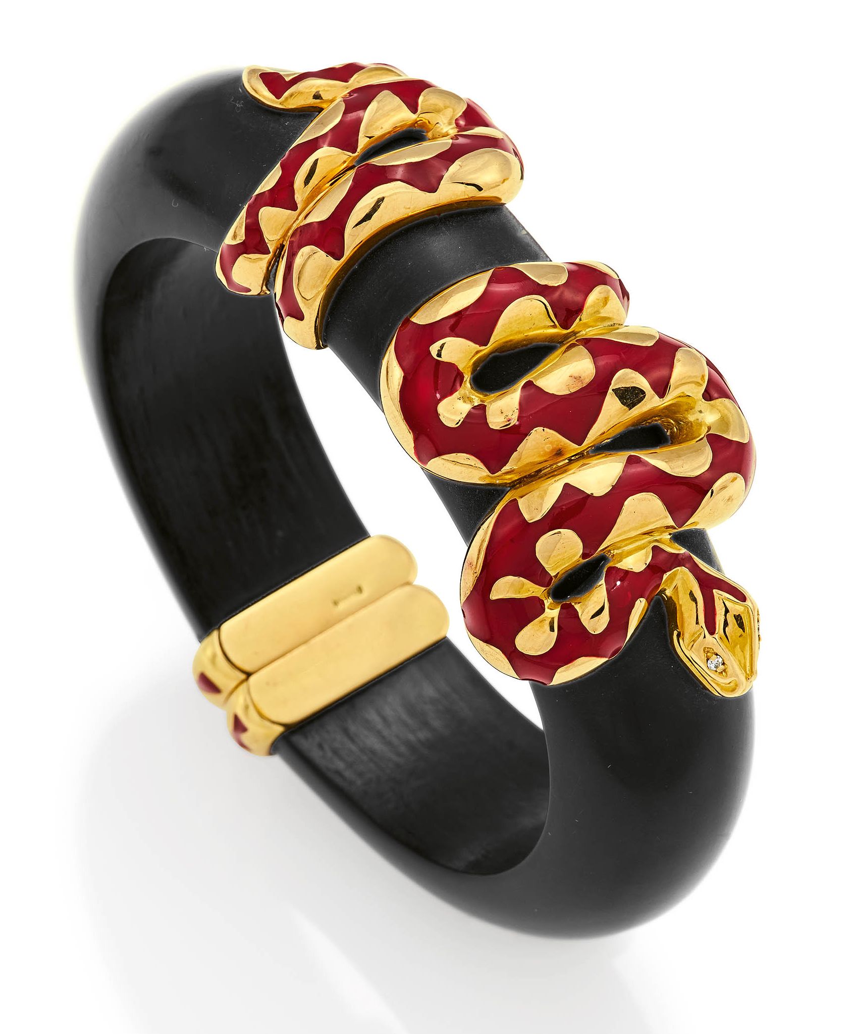 Beschreibung: Rotes Email formt das gezackte Muster der Schlange. Signatur "Friedrich".