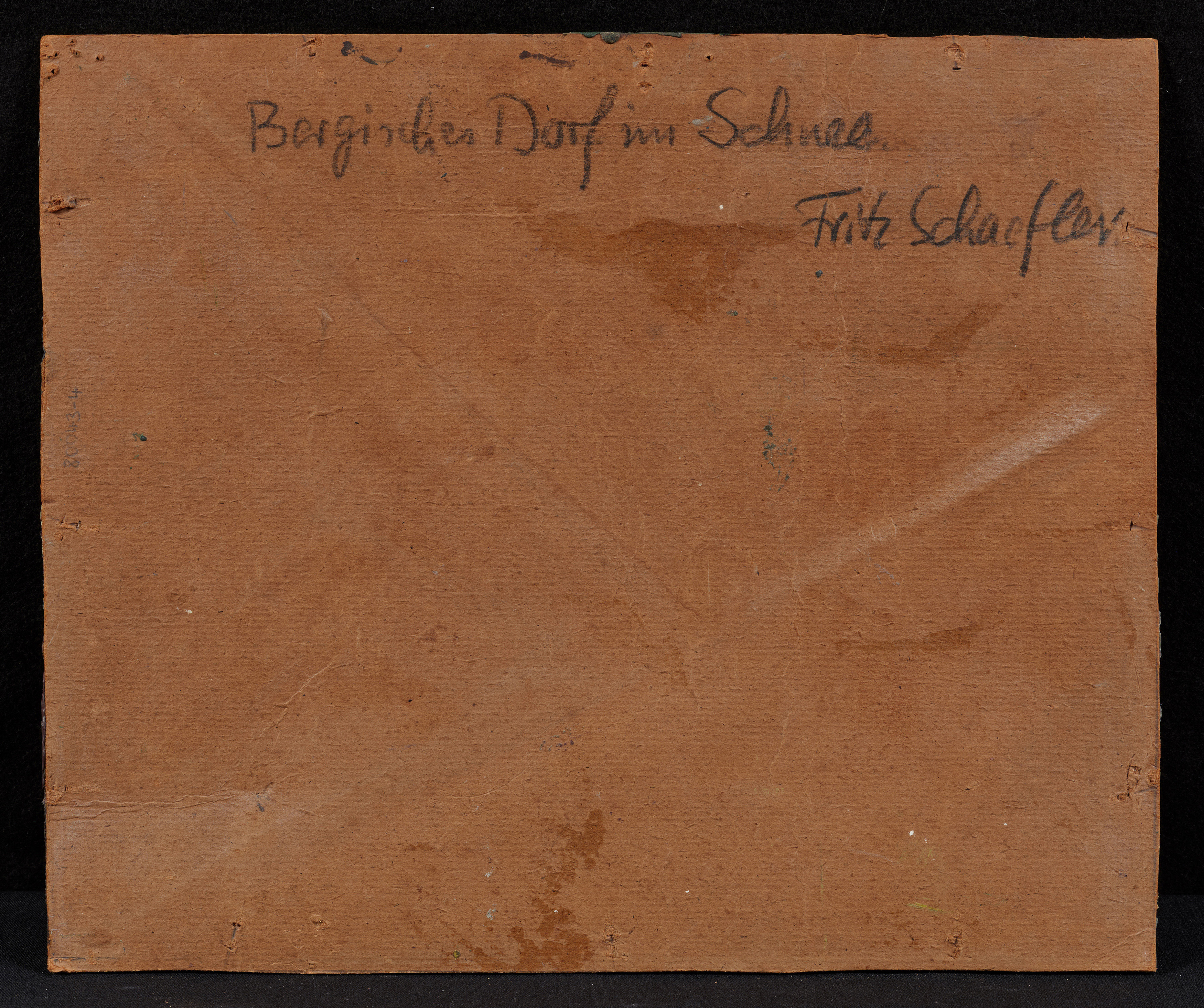 Bezeichnung: Signiert unten rechts: Fr. Schaefler. Sowie betitelt und signiert verso oben: Bergisches Dorf im Schnee Fritz Schaefler.